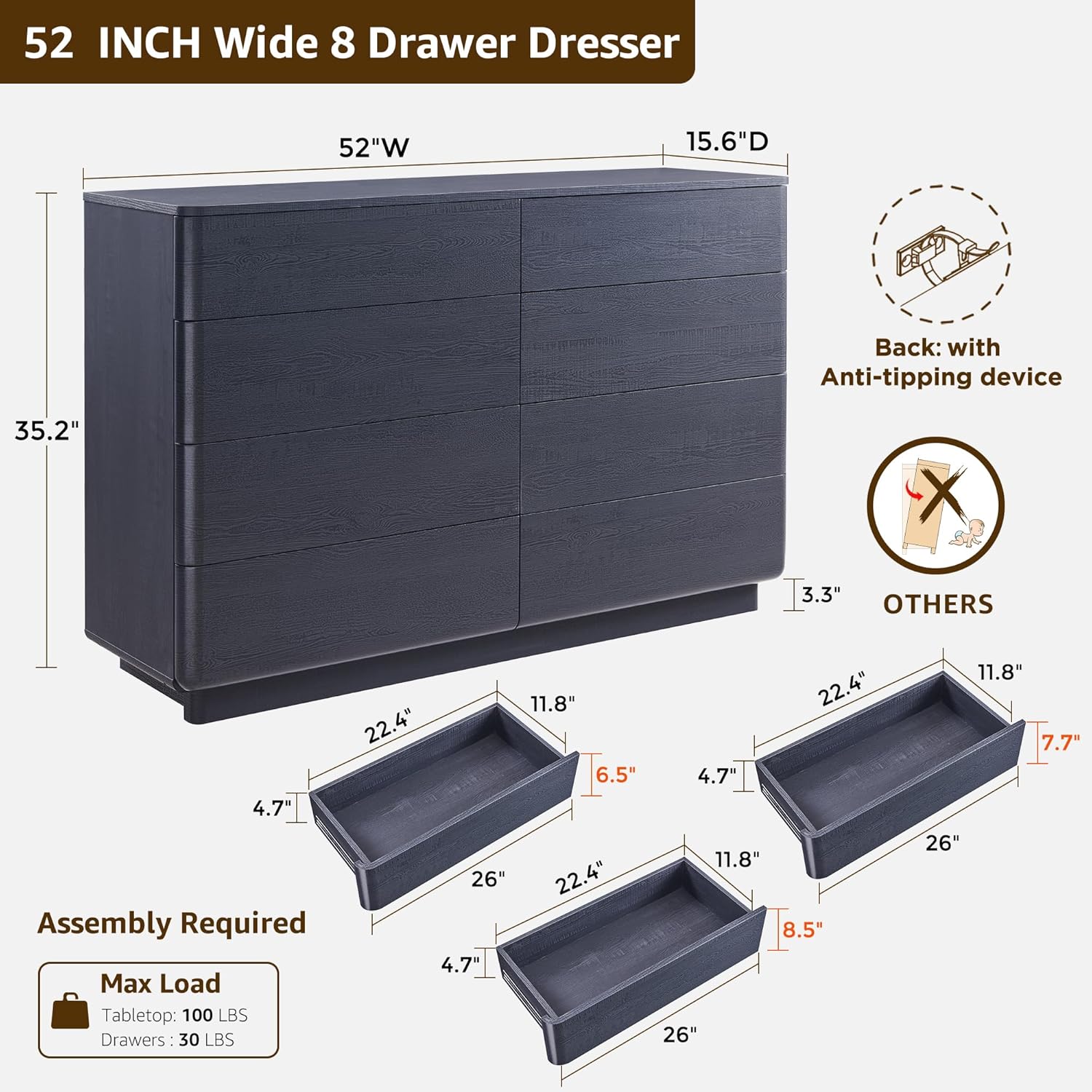 8 Drawer Dresser for Bedroom, 52 Inch Wide Modern Chest of Drawers, Push-to-Open Wood Storgae Organizer with Large Drawers for Bedroom, Living Room, Hallway, Black