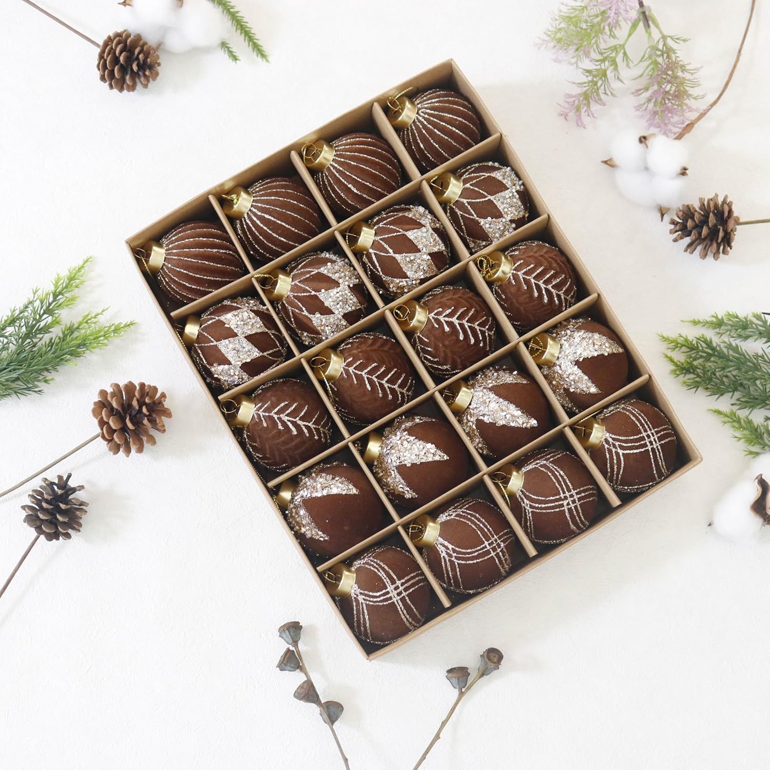 - Package List:the package contains 20PCS of flocked Christmas ball ornaments with glitter,2.36inches in diameter,solid color packed to choose,nice texture can fully meet your needs for decorating