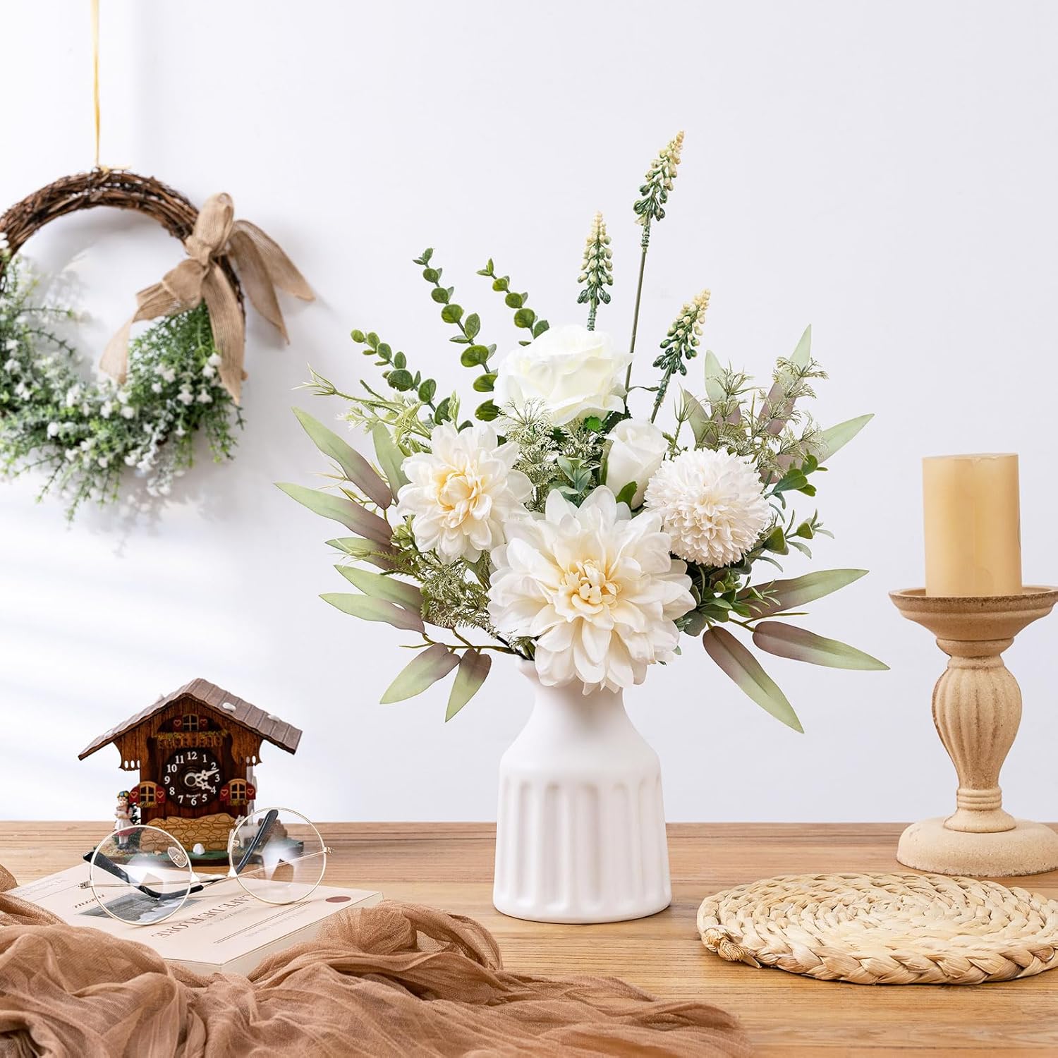 - Complete Artificial Flower Set with Vase: This artificial flowers in vase for decoration includes lifelike fake dahlia, kiku flower, roses, fake plants and a white ceramic vase. Perfect as a table centerpieces for dining room, kitchen table decor, farmhouse table decor, coffee table decor, mantel decor, and rustic-style interiors.