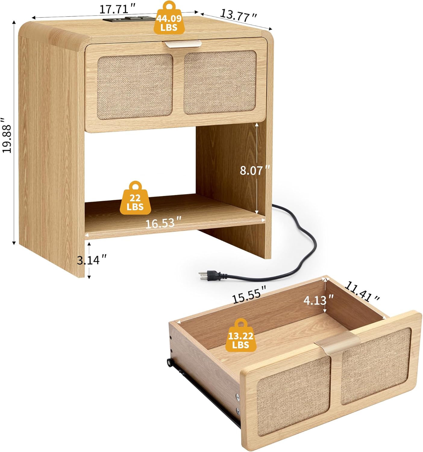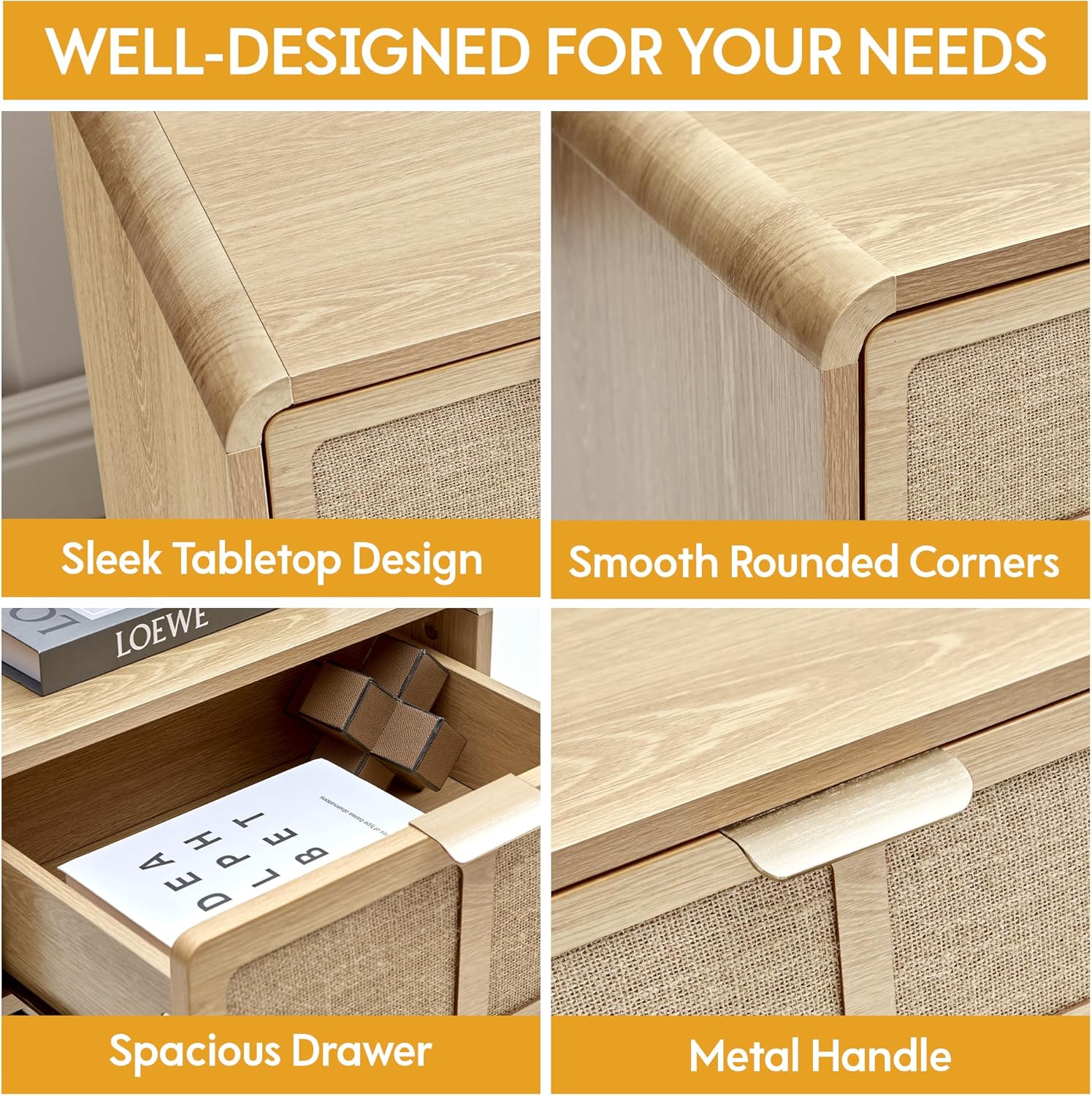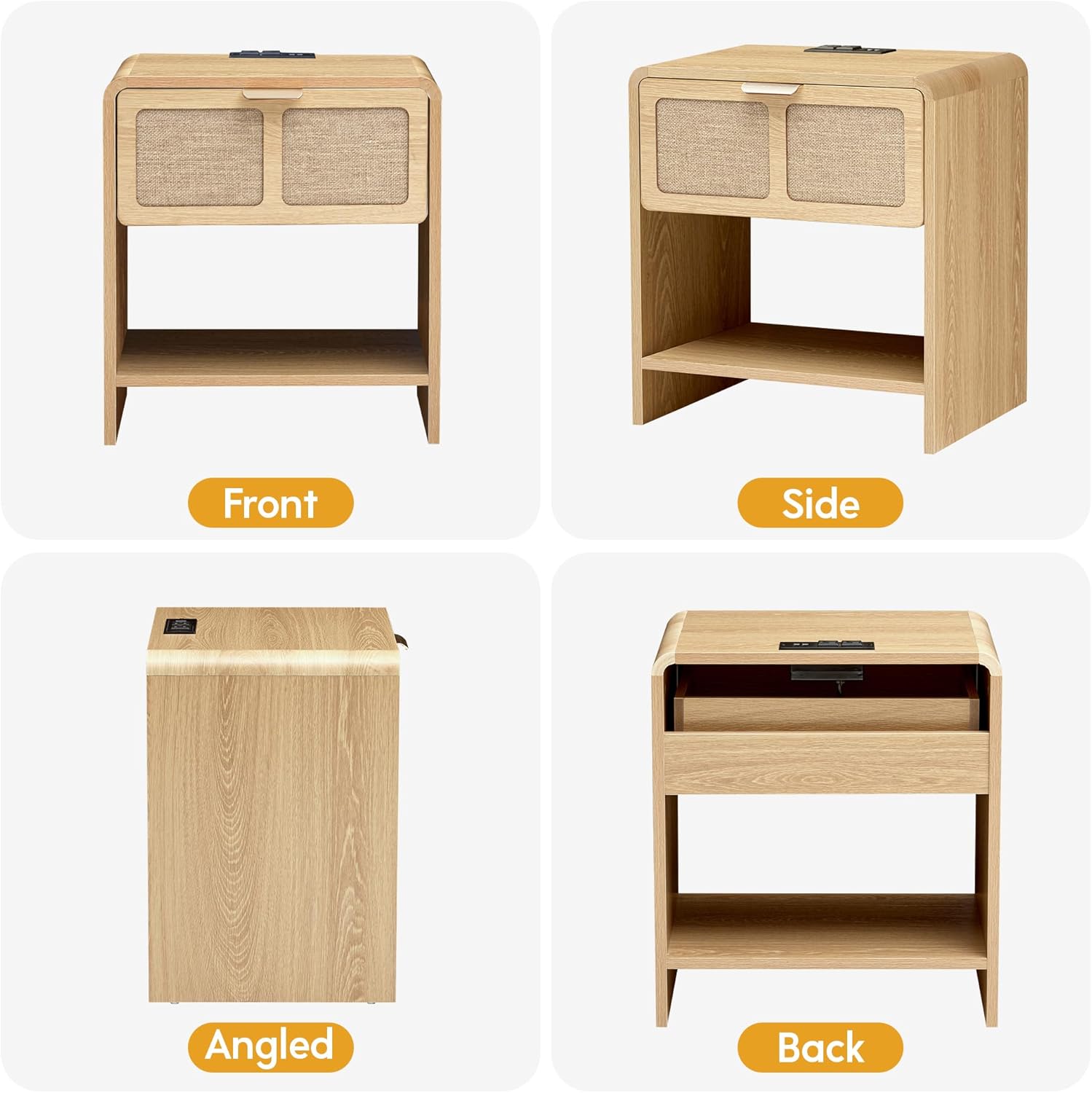 LEVNARY Nightstand with Charging Station, Mid-Century Modern Bedside Table with Curved Top Corners and Fabric-Like Textured Drawer, Wooden End Table for Farmhouse Bedroom Living Room (1, Natural)