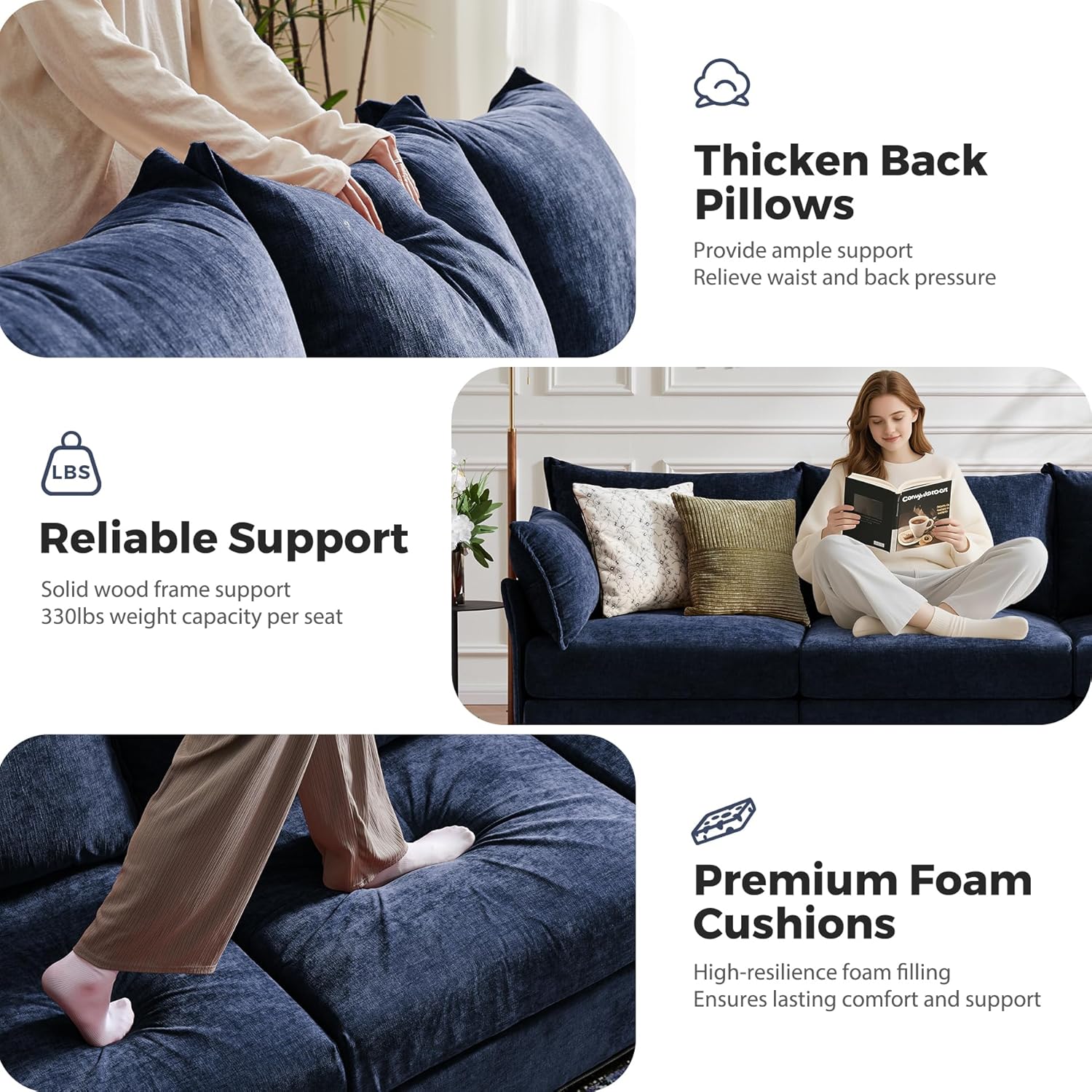 - đź’ˇ Premium Chenille Fabric - The modern sofa is upholstered in premium chenille fabric that feels luxurious to the touch, offering both comfort and durability. The material is not only soft and inviting but also non-pilling and won't stain, ensuring long-lasting quality.