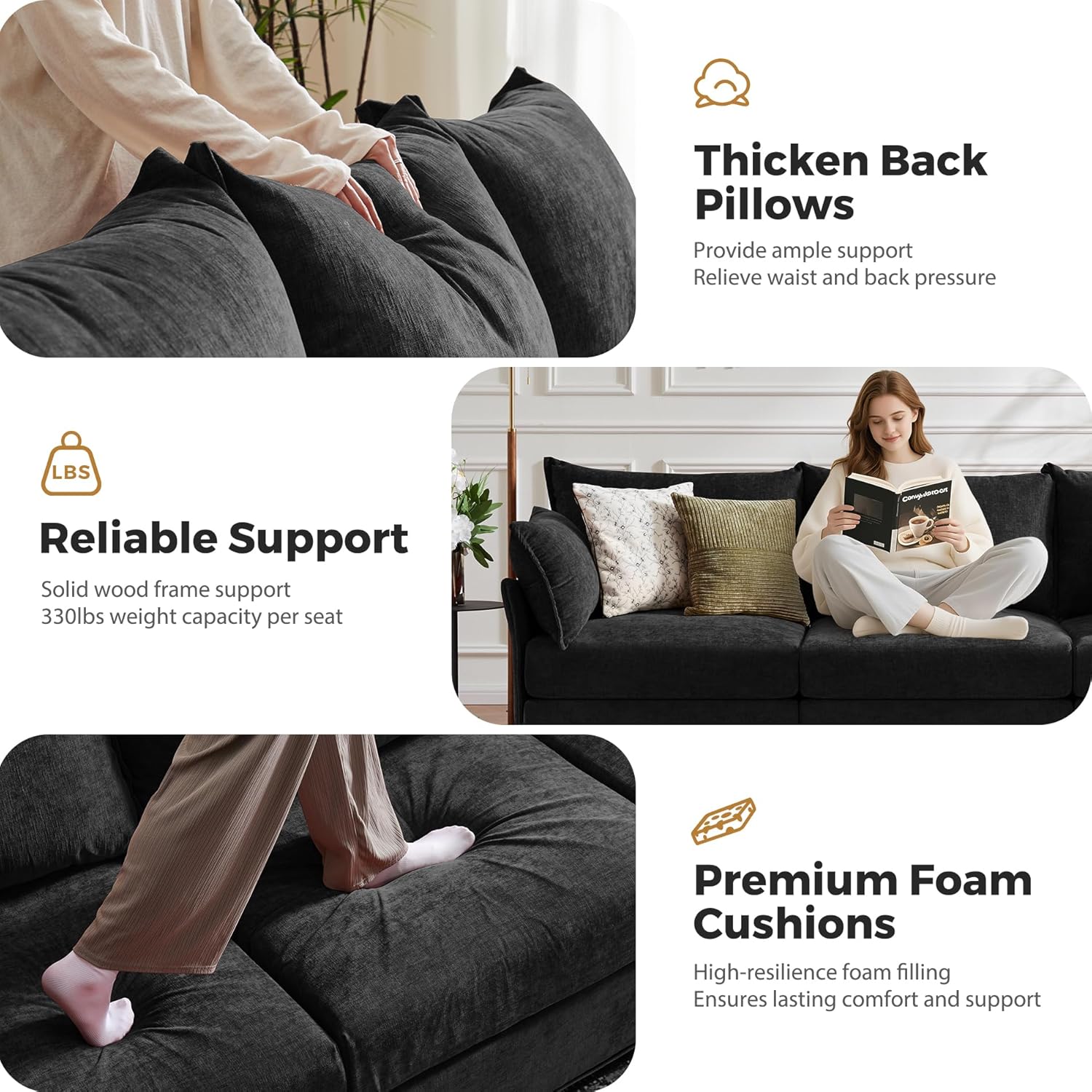 - đź’ˇ Premium Chenille Fabric - The modern sofa is upholstered in premium chenille fabric that feels luxurious to the touch, offering both comfort and durability. The material is not only soft and inviting but also non-pilling and won't stain, ensuring long-lasting quality.