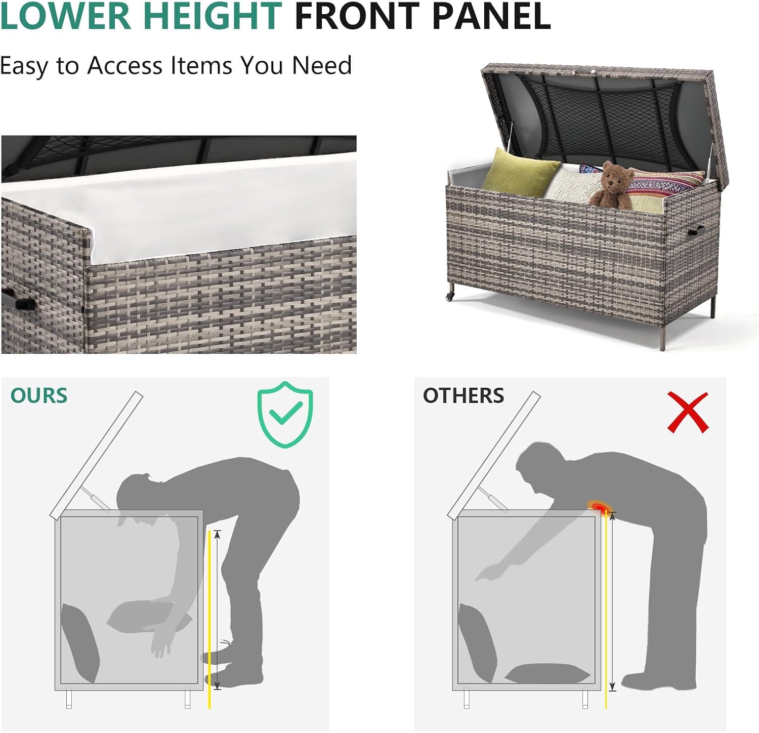 - Practical Details: Our patio storage bins come with 2 durable and silent wheels, enabling smooth movement across various surfaces. The front panel features a low-profile design, minimizing the risk of accidental bumps and providing a clear view of the contents inside. This thoughtful feature makes accessing your stored items a breeze