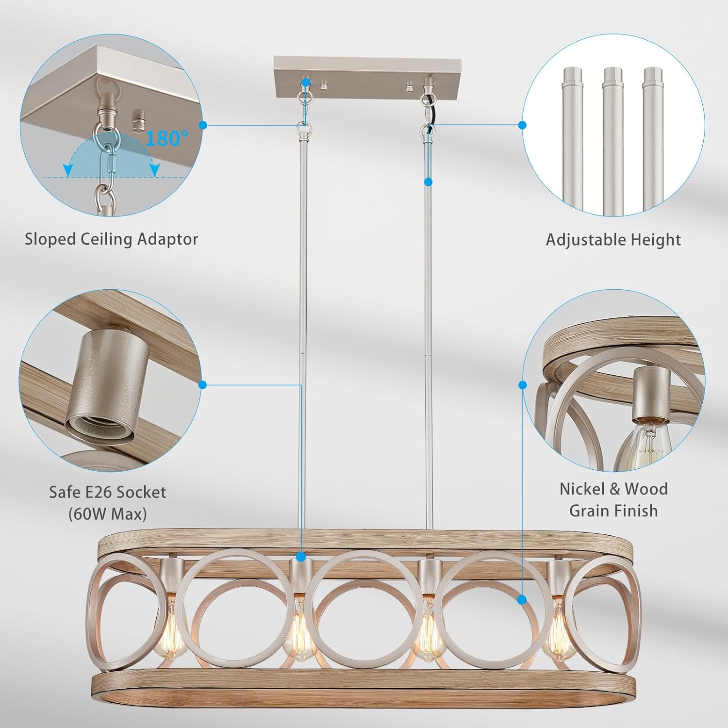 XINGQI Kitchen Island Chandelier for Dining Room Modern Farmhouse Rectangle Pendant Lighting Fixture Vintage Linear Hanging 4-Light Rustic Living Room, Antique Brushed Nickel and Wood Grain Finish