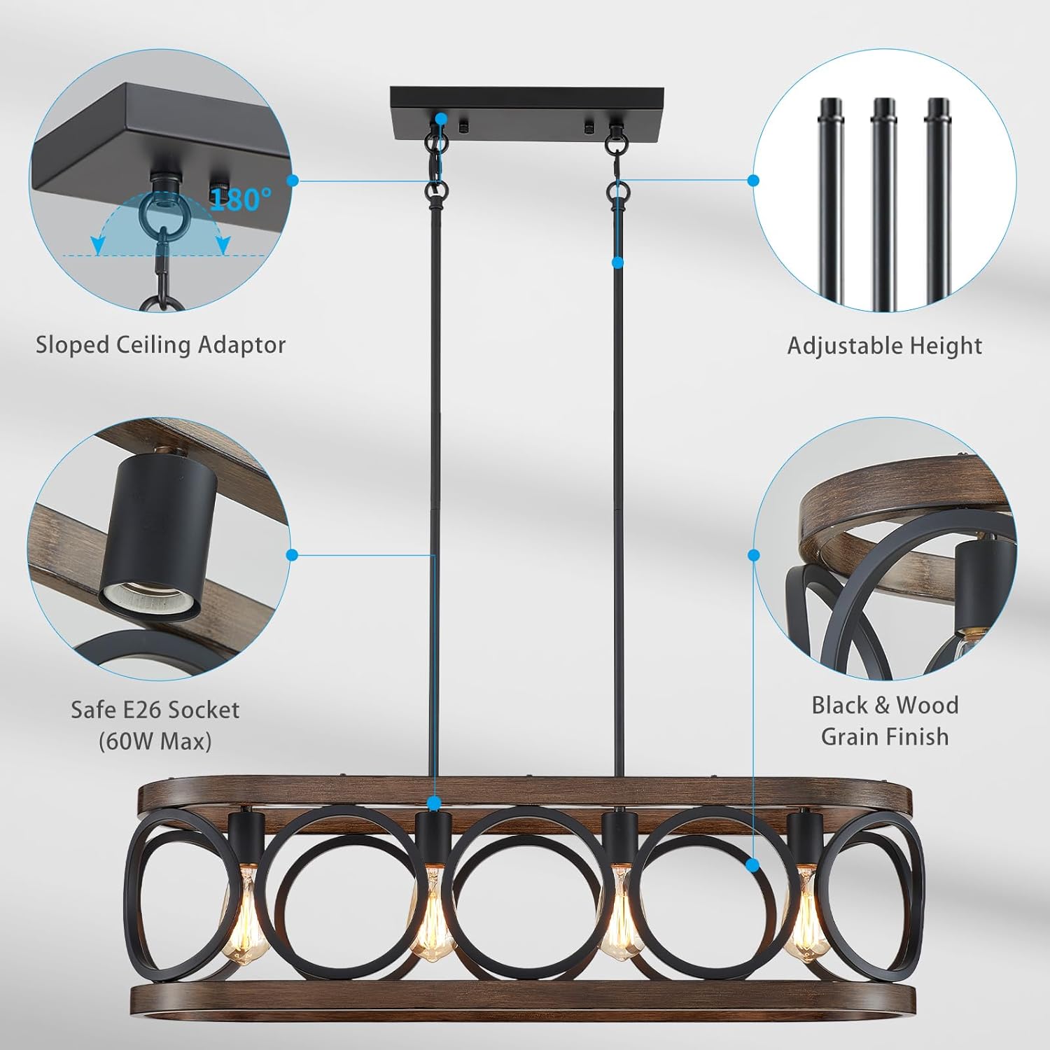 - Multiple Bulb Compatibility: The chandelier accommodates 4 x E26 bulbs (max 60W, not included) and is compatible with various bulb types including LED, CFL, halogen, and incandescent. The safety-compliant bulb base allows for use with a dimmer switch, enabling you to create the perfect lighting environment