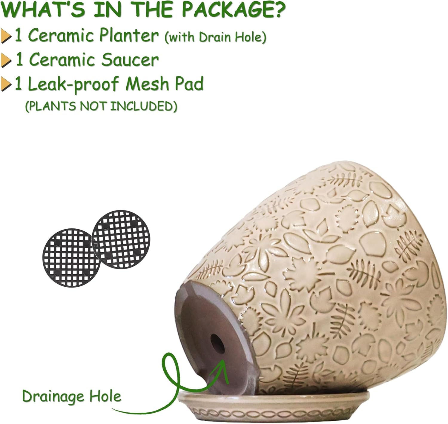 - Size & Package: 10 Inch Pot . Package: contains 1 ceramic flower pots, 1pcs mesh pads and 1pcs saucers(NOT INCLUDE PLANTS)