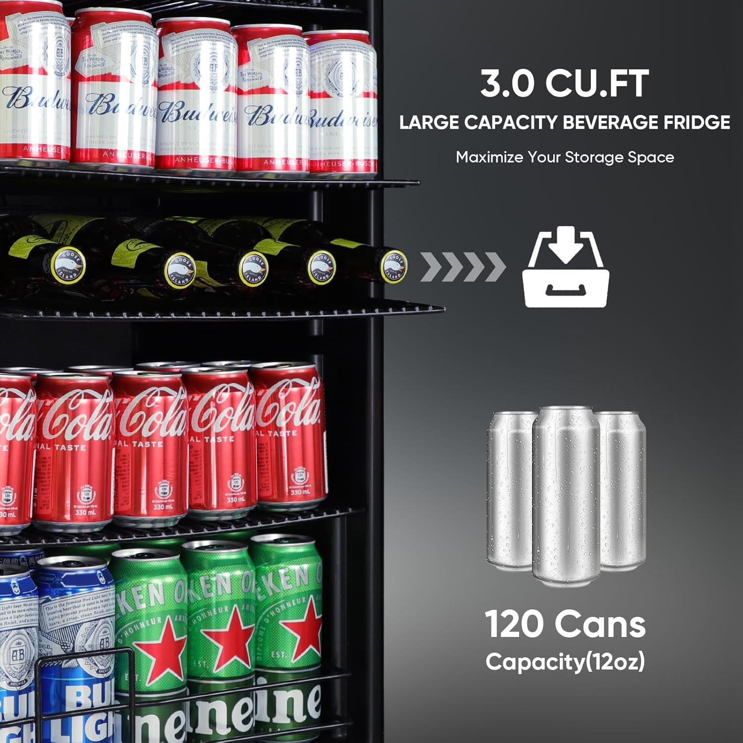 120 Can Beverage Refrigerator – Mini Fridge with Glass Door for Soda Beer or Wine, Beverage Cooler for Bedroom, Office, Bar with Adjustable Shelves & Digital Temperature Display, Silver