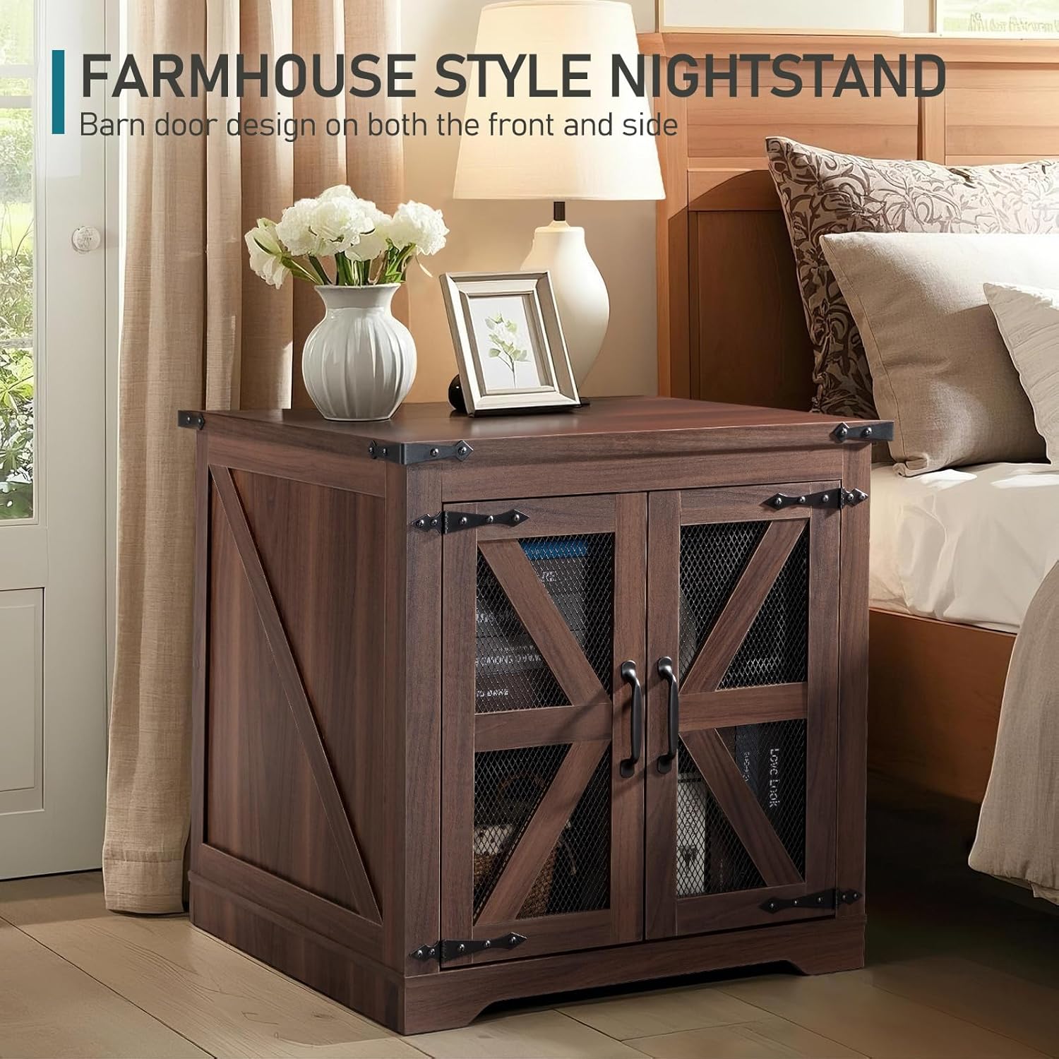 Farmhouse End Table Set of 2, 24" Large Sofa Side Table with Charging Station, Mesh Barn Door, Rustic Wood Nightstand with Adjustable Storage Shelf, Square Nightstand for Living Room