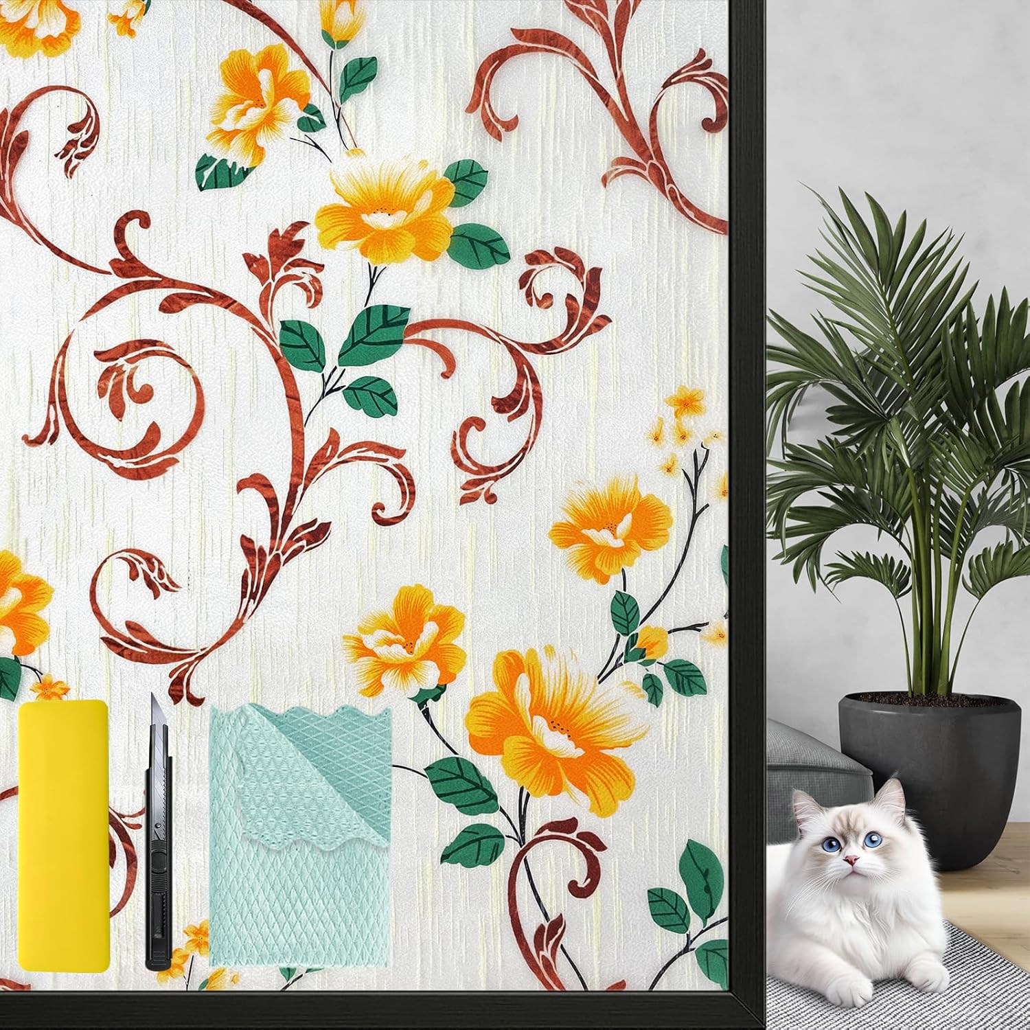 Niviy Stained Glass Window Privacy Film with Installation Tools, 3D Frosted Glass Window Decals UV Protection Sun Blocking Static Clings Non Adhesive Window Stickers for Home 17.5 x 78.7 inch
