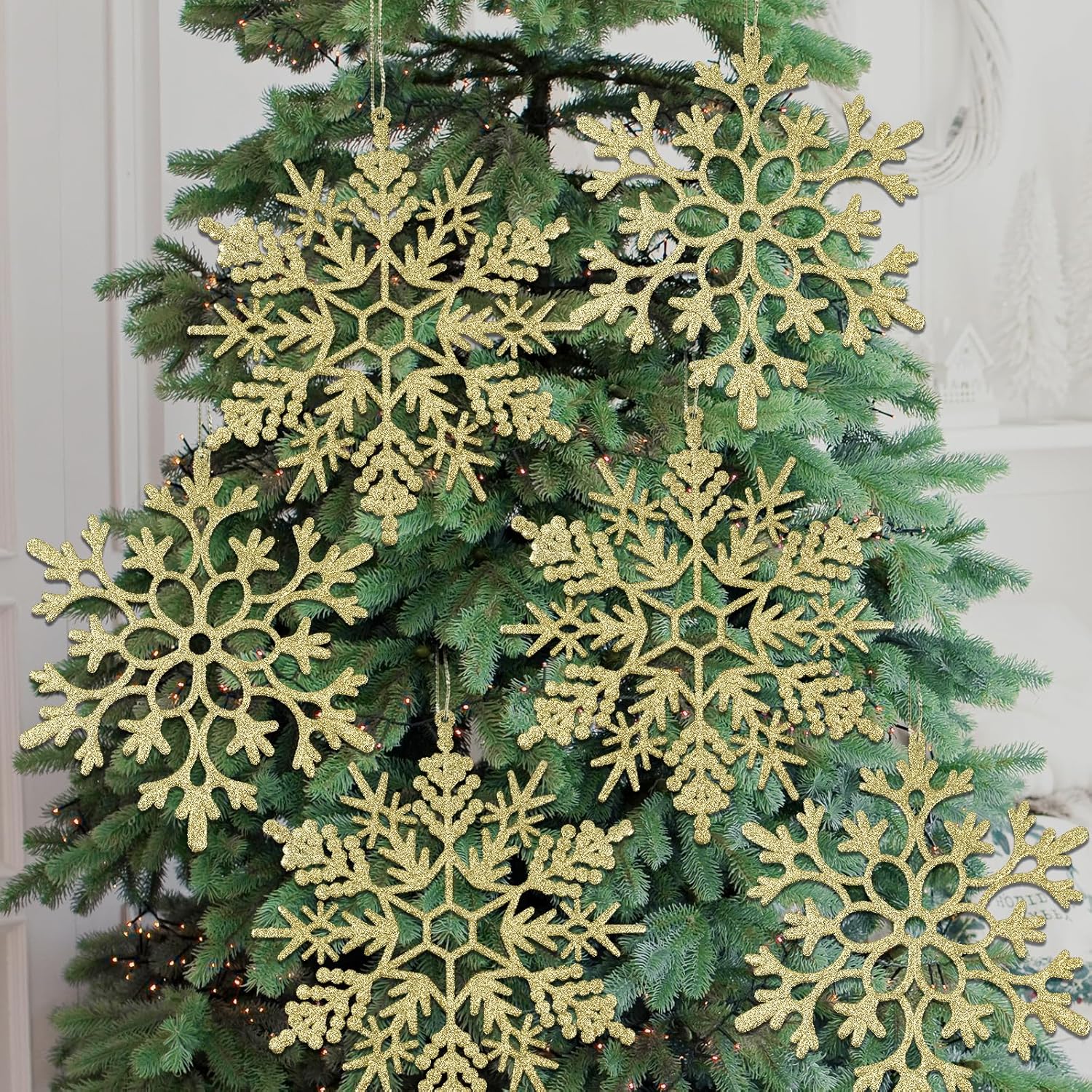 - Premium Snowflakes: These stunning gold snowflakes are crafted from high-quality plastic with a dazzling shimmer. Their durable design allows for years of reuse while maintaining perfect shape. The glitter is securely adhered and resists flaking, making them an ideal choice for Christmas tree decorations