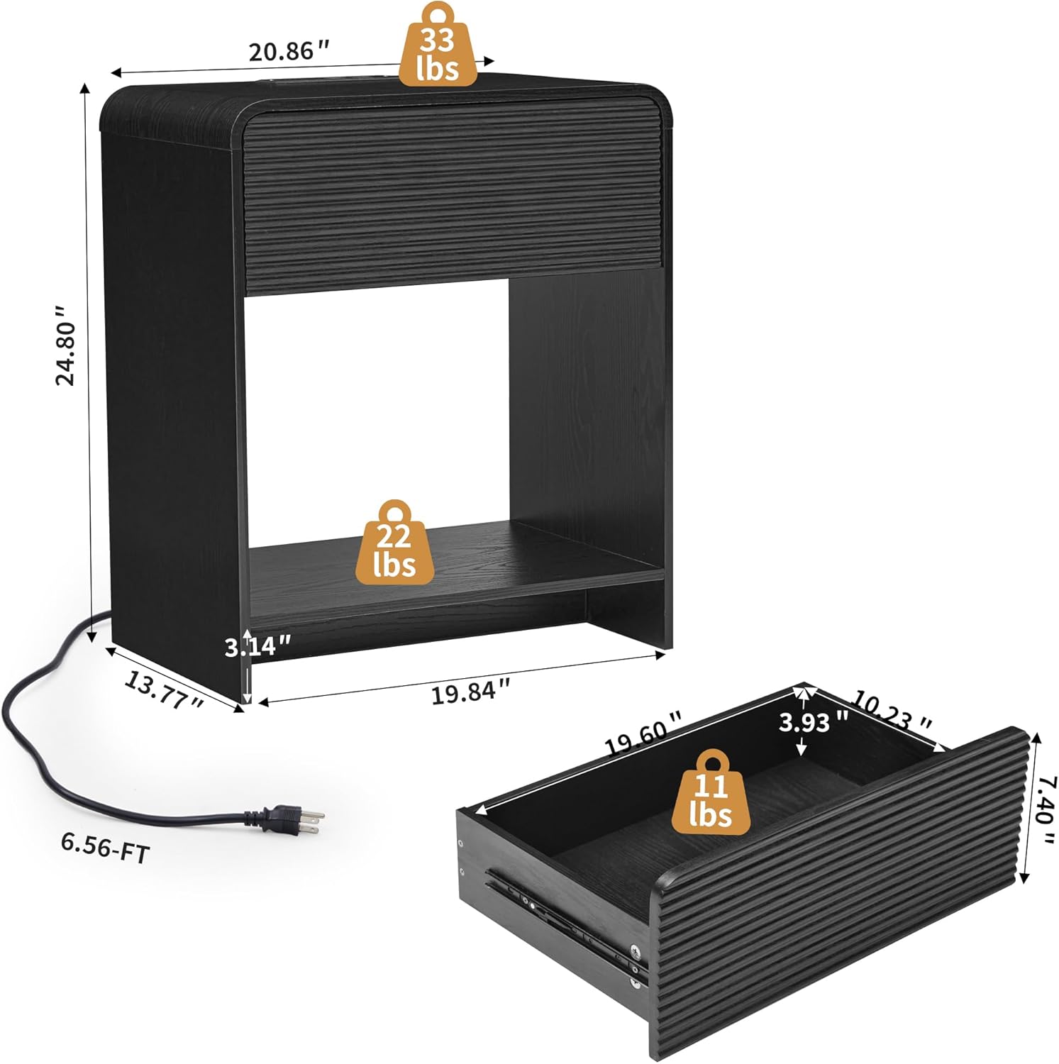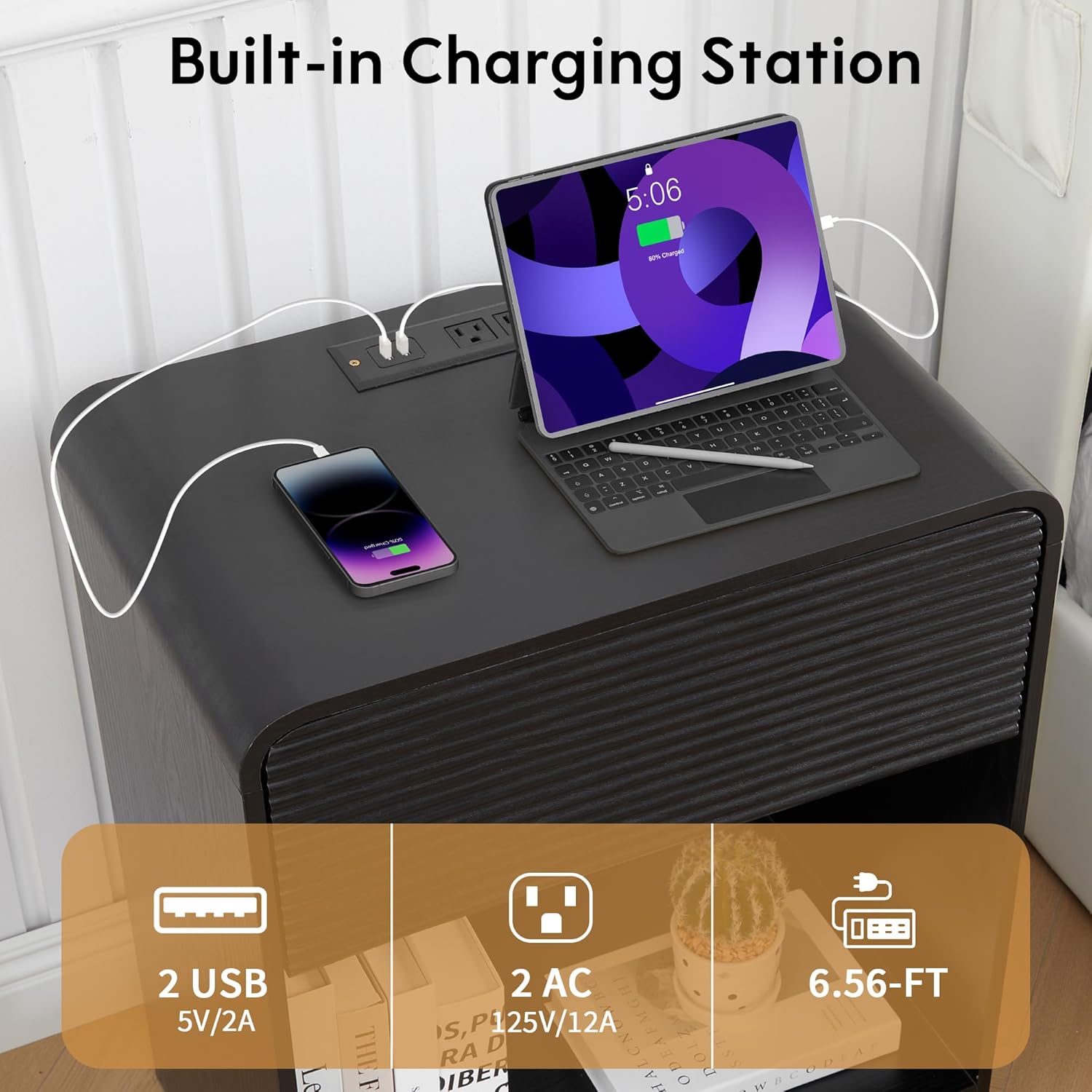 - ăVersatile Nightstand with Charging StationăBedside Cabinet with 2 AC outlets & 2 USB ports conveniently located along the top, this nightstand has your charging needs covered. Measuring 20.86"W Ă 13.77"D Ă 24.8"H, our large nightstand provides ample storage space for all your bedside essentials. From books and reading glasses to electronic devices and personal items, everything can find its place within this spacious night stand. With its roomy desktop, large drawer, and open compartment, our bedside table allows you to keep your belongings tidy and within reach.