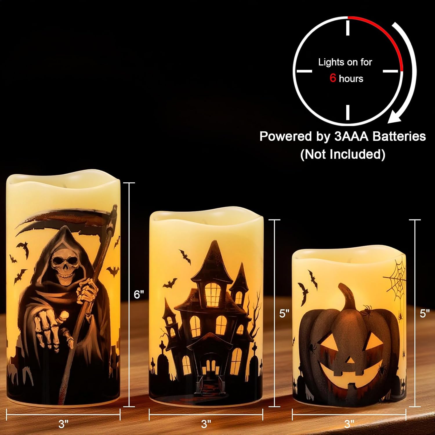 - REAL WAX LED CANDLES: You will get 3 Halloween flameless candles with a Grim Reaper, a Pumpkin, a Castlel, diameter 3" with 4"x 5"x 6" height, all candles are made of real wax to make them more realistic