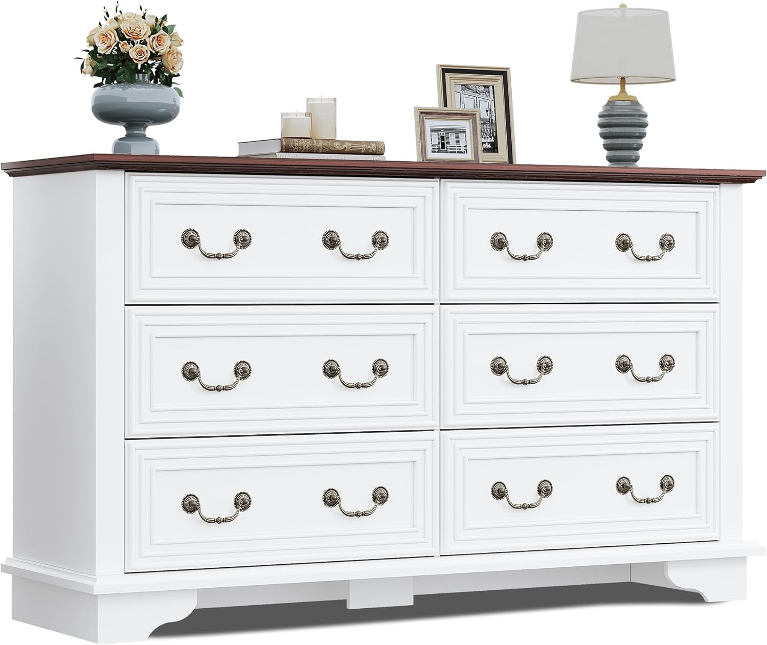 WLIVE Farmhouse Dresser for Bedroom, 51.97'' Wide Wood White Dresser with 6 Drawer, Chest of Drawers with Roman Metal Handle, TV Stand for 60 inch TV, for Living Room, Hallway