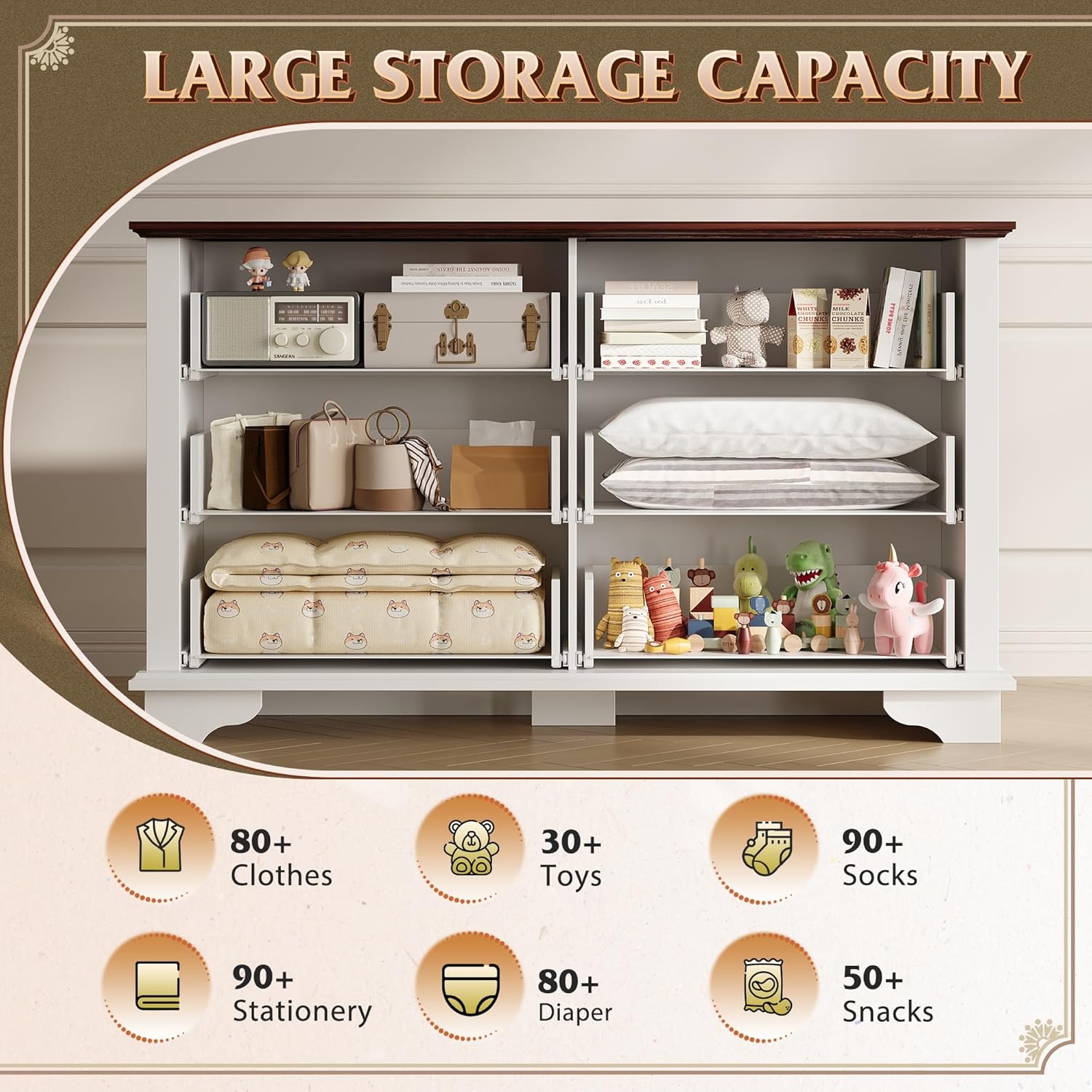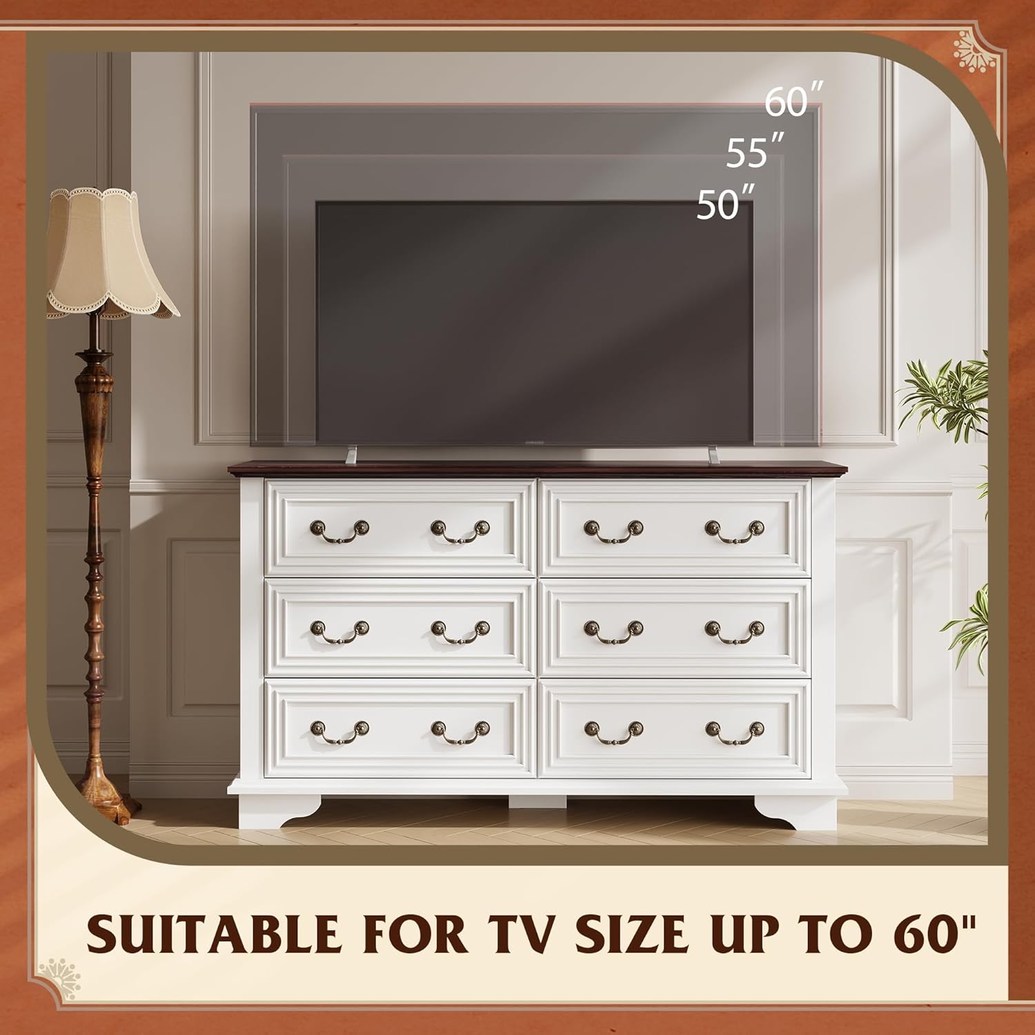 - ăSpacious Storage SpaceăThe bedroom dresser measures 15.75"D x 51.97"W x 30.94"H, comes with 6 large drawers to store and sort clothes/toys/blankets and other household items. This dresser organizer also works perfectly as a TV cabinet and can hold up to a 60-inch TV.