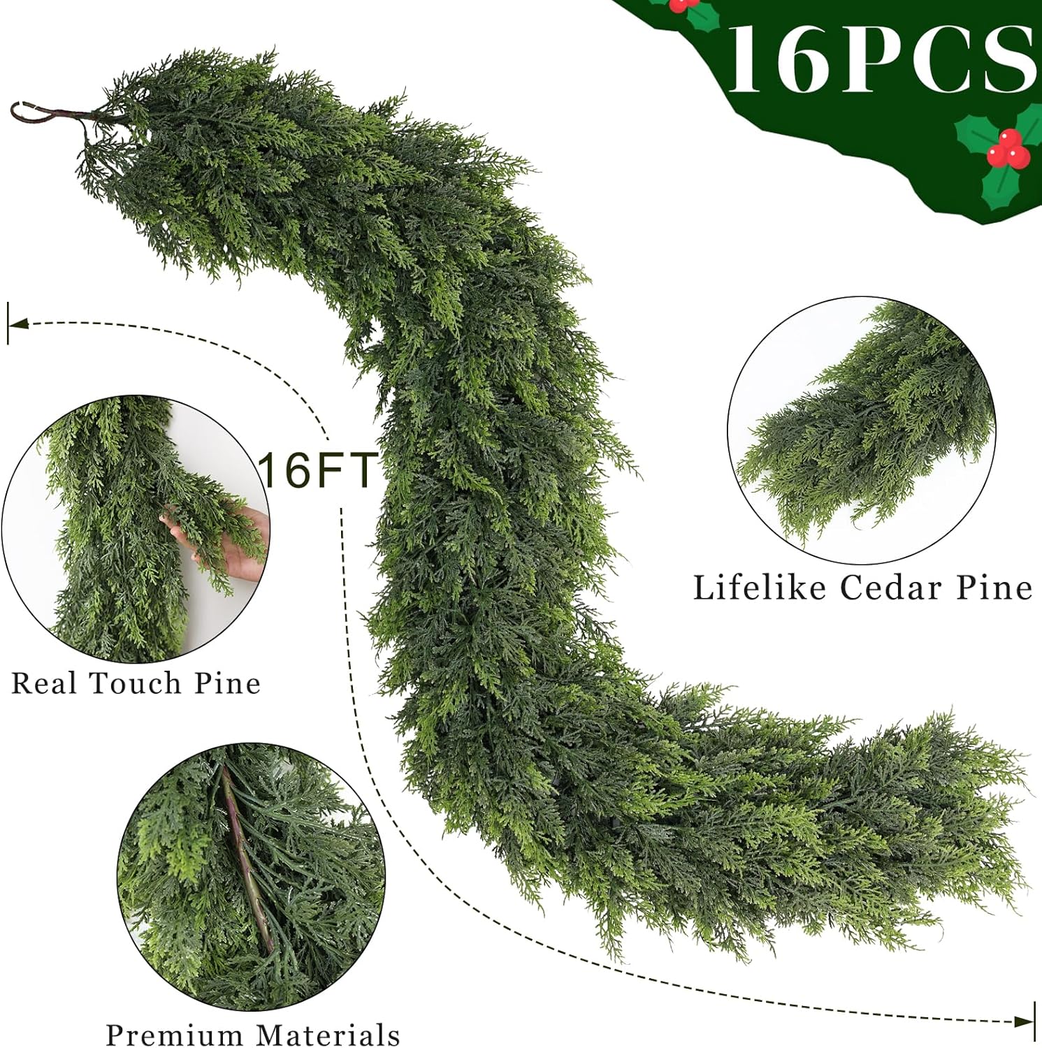 16FT Real Touch Cedar Garland - Artificial Christmas Garland Fake Green Faux Thick and Lush Pine Needles Garlands for Table Fireplace Mantle Holiday Home Indoor Outdoor Decor (1PCS)