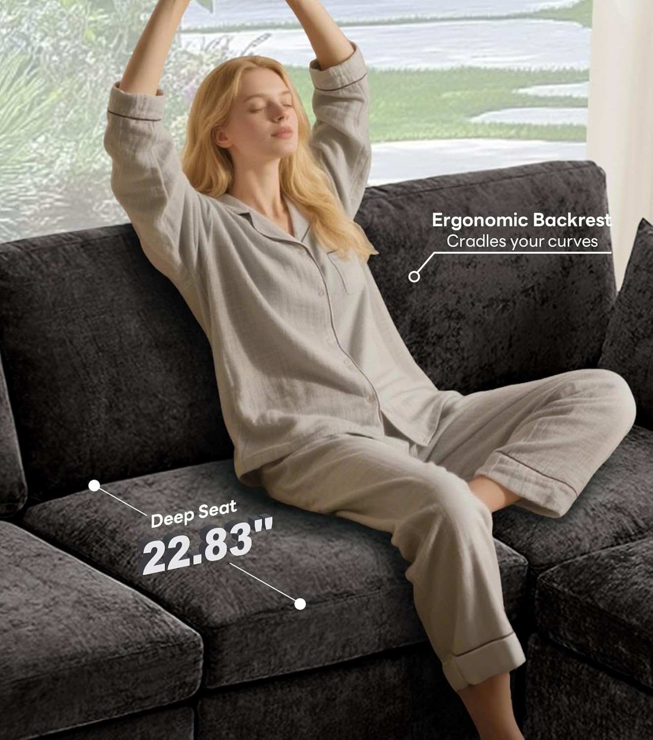 - Chenille Fabric - Wrapped in chenille fabric, this sectional couch combines velvety softness with everyday durability. The dense, textured weave resists pilling while maintaining its plush feel, and its naturally breathable properties keep you comfortable in any season.