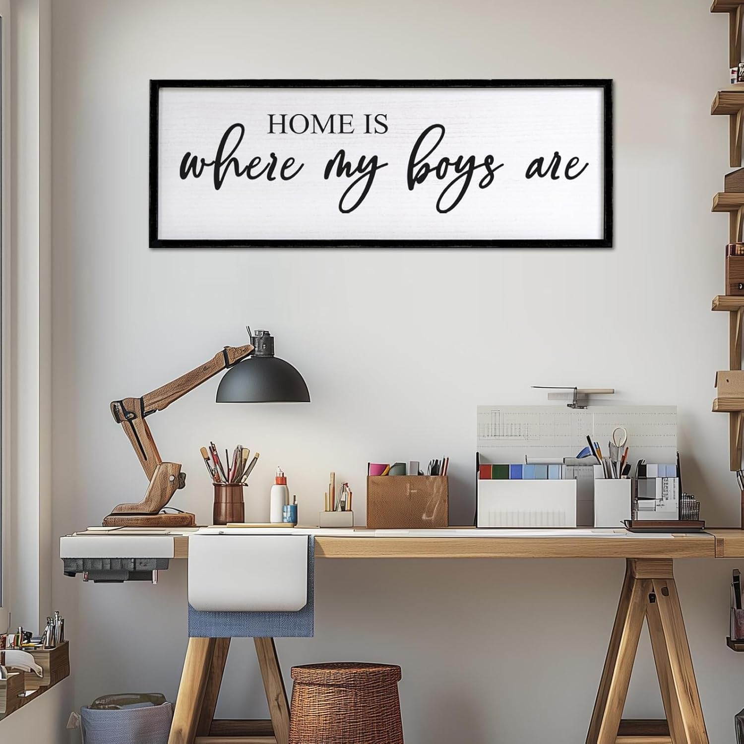 Home is Where My Boys are Sign Framed Wall Art, 32''×12'' Rustic Horizontal My Son Plaque with Black Frame for Baby Kid Boy Son Teen Toddlers Room, Horizontal Mom of Boys Gifts Nursery Decor