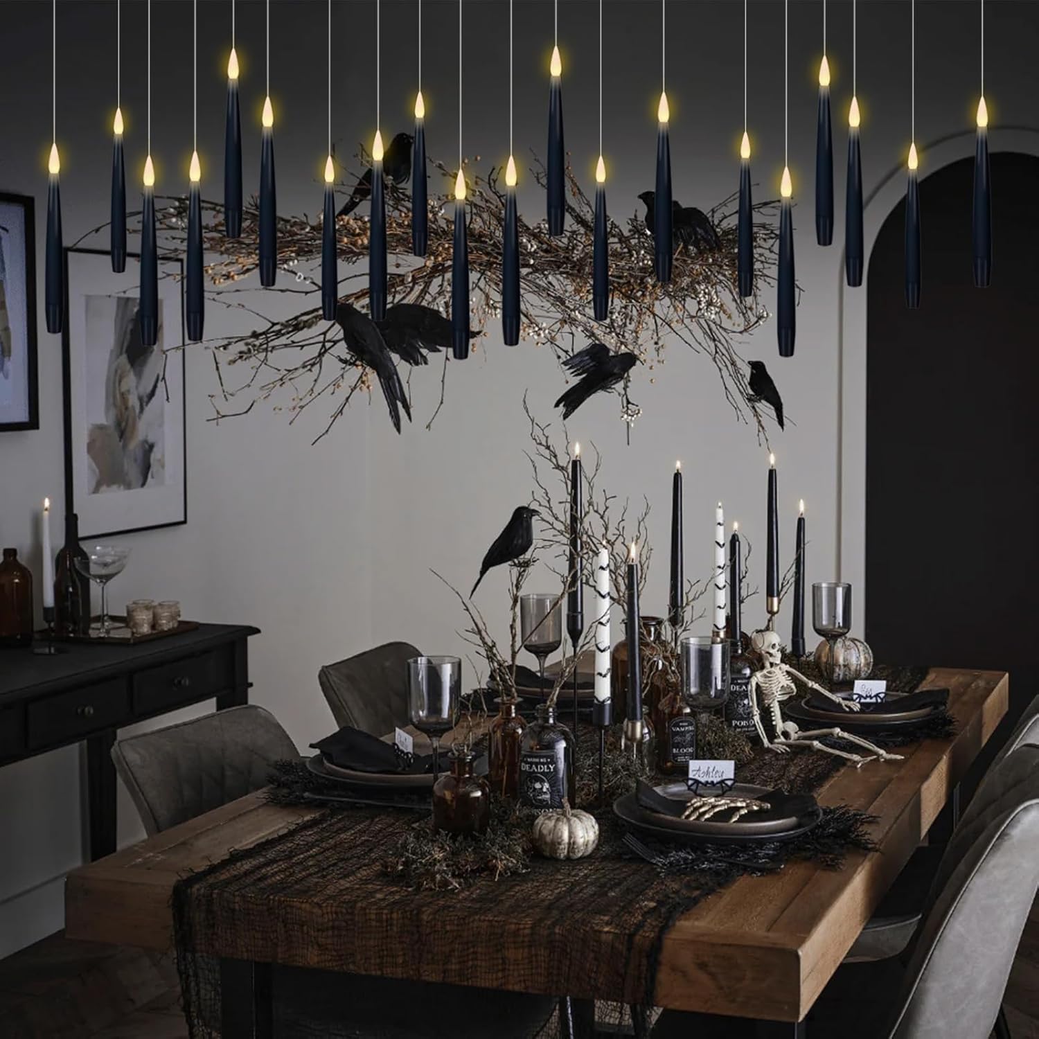 - Hanging candles for Halloween Decoration: This set of flameless candles is equipped with a 4.9ft fishing line(barely visible) pre-attached to these LED taper candles ready to hang. you can easily cut the length you like and thread it through the top, making it easy to hang straight and even. Perfect Halloween decor for holidays, church services, window candles, the fireplace, table, home & outdoor decoration.