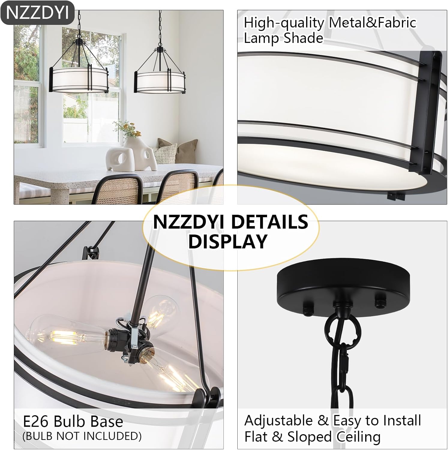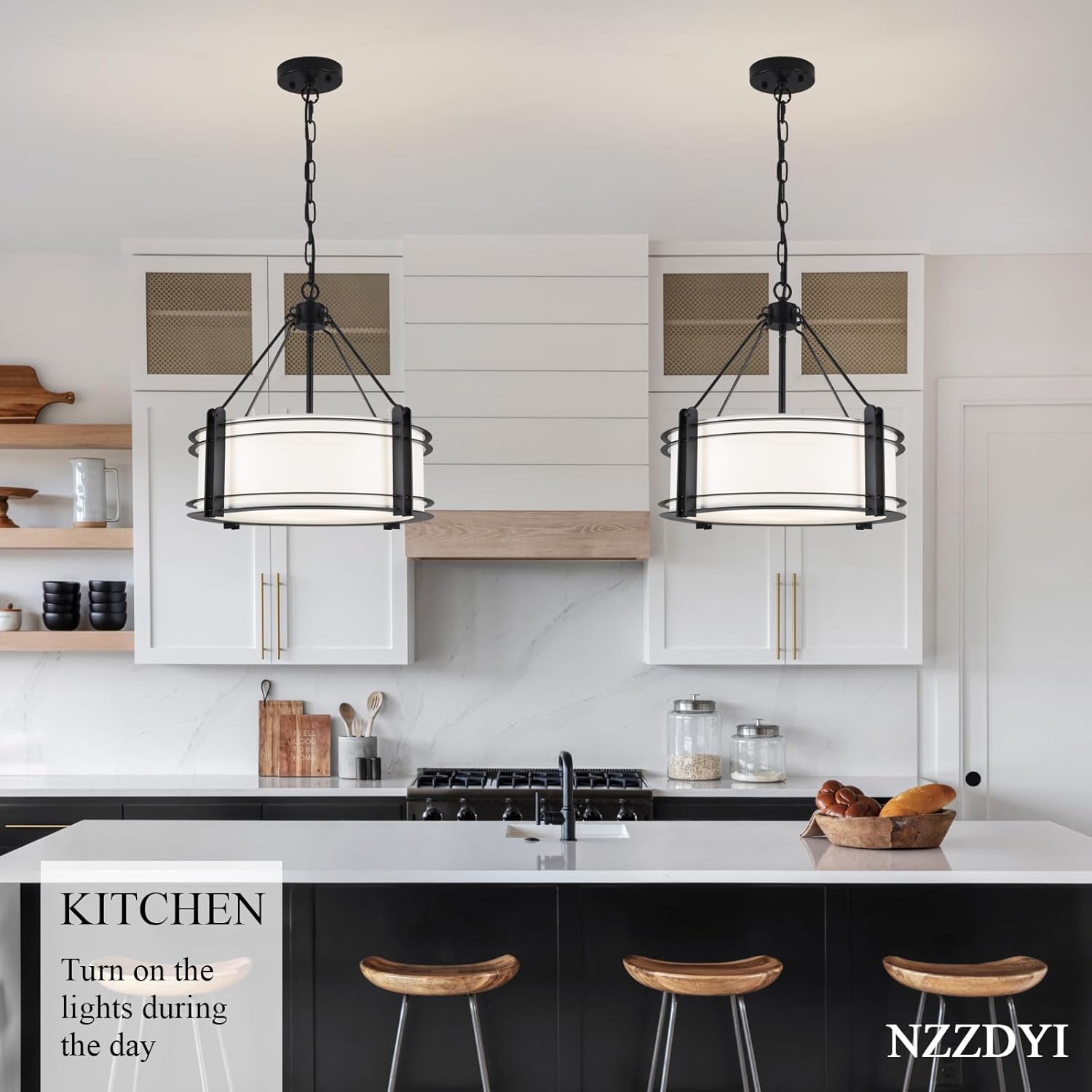 - 【15-Minute Easy Installation】The drum pendant light kitchen island features a simple design and comes with clear instructions and all necessary hardware. You just need to fix the lamp holder and the lampshade together,then install the light fixture on the home circuit and install the bulb,you can enjoy a perfect black farmhouse drum pendant light in less than 15 minutes