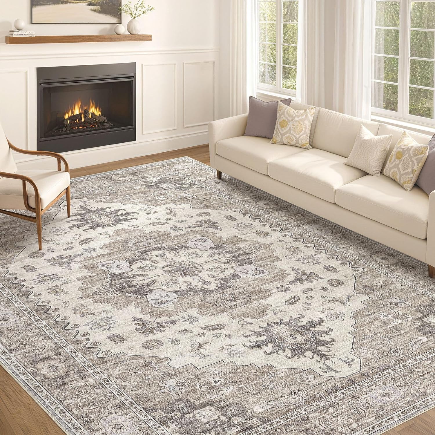Washable Area Rugs for Living Room - 10x14 Neutral Vintage Distressed Floral Farmhouse Boho Large Soft Floor Rug Indoor Non Slip Carpet for Living Room Bedroom Dining Room Office-Brown/Beige