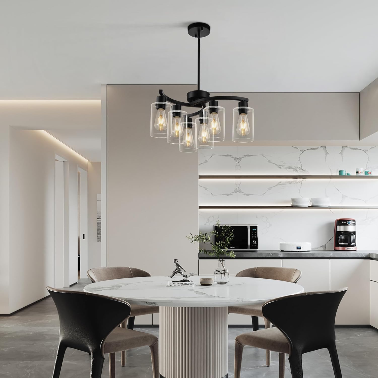 - ✨ Modern Minimalist Aesthetic Design:6 light modern farmhouse chandelier is meticulously crafted with black metal spiral lamp arms, featuring clean geometric lines that create a three-dimensional layered effect. Paired with a transparent glass lampshade, the light is evenly diffused, highlighting the beauty of the light source while enhancing the brightness and transparency of the space. It perfectly complements industrial, minimalist, and modern home styles, effortlessly becoming the visual focal point of the space.