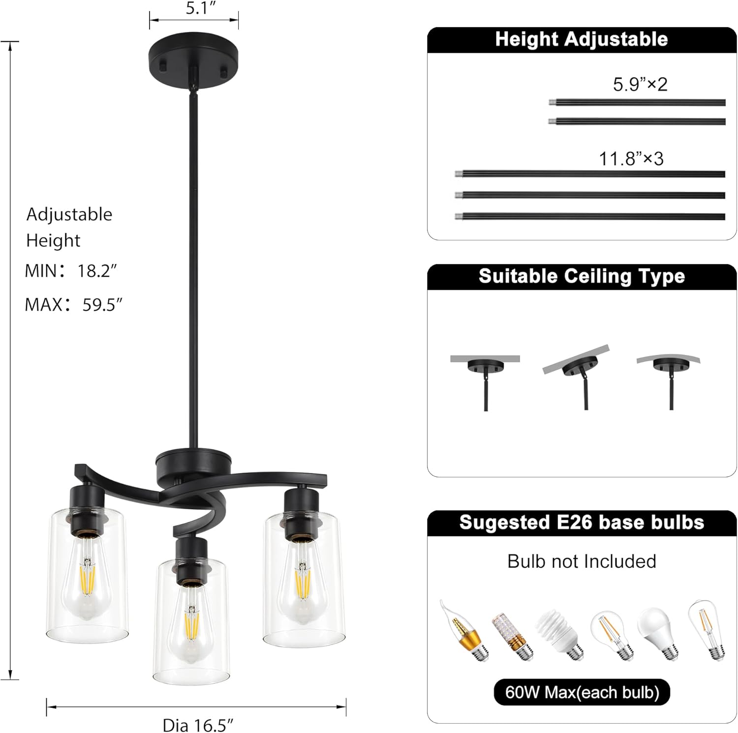 3 Light Modern Dining Chandeliers Over Table,Black Light Fixture for Dining Room,Farmhouse Chandelier with Glass Shade,Industrial Pendant Lighting for Kitchen Island,Foyer,Hallway, Bedroom