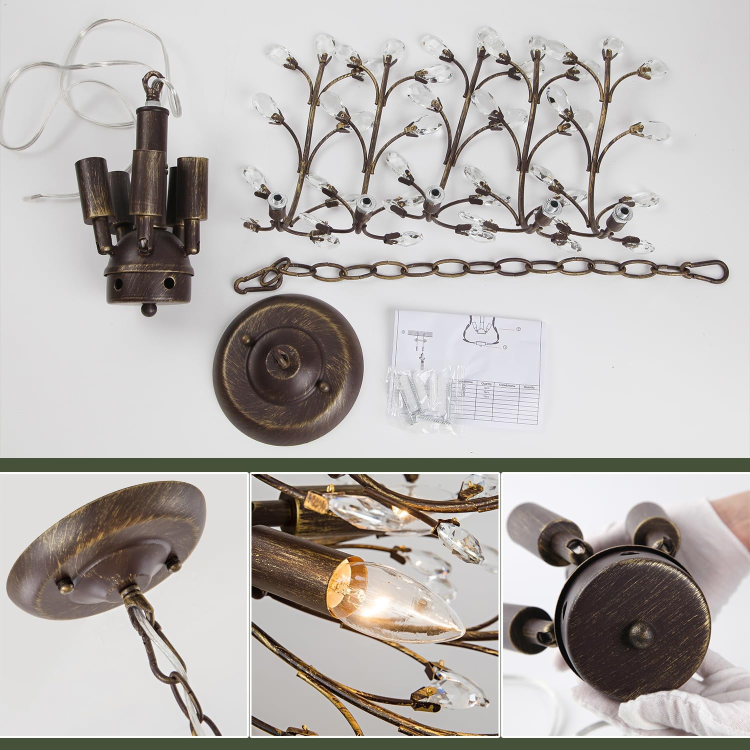 - [Vintage K9 Crystal Branch Chandelier] Our vintage crystal chandelier in aged bronze color, tree branch nature design. With K9 crystal decorations, the whole pendant light fixture adds more vintage and luxury style.
