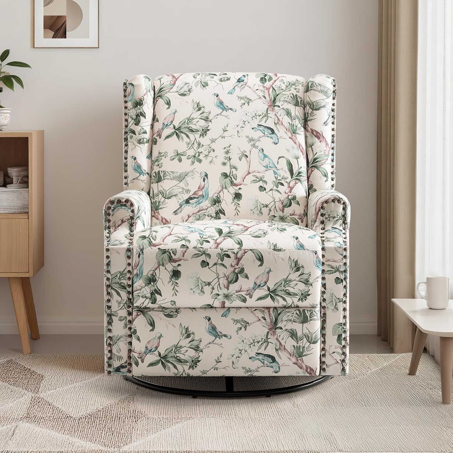 UIXE Swivel Rocker Manual Recliner Chair, Wingback Swivel Glider Fabric Nursery Reclining Sofa Chair, High Back Upholstered Arm Chair for Living Room Bedroom - Bird Pattern