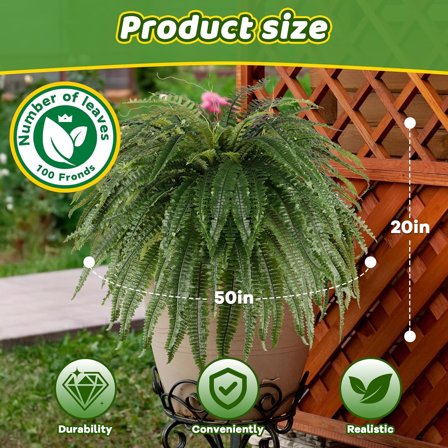 - đŽă20Inch Tall with 50Inch SpreadăThis large fake fern stands 20" tall with an impressive 50inch wide spread. Features 100 lifelike leaves with 25inch long fronds for exceptionally full coverage.