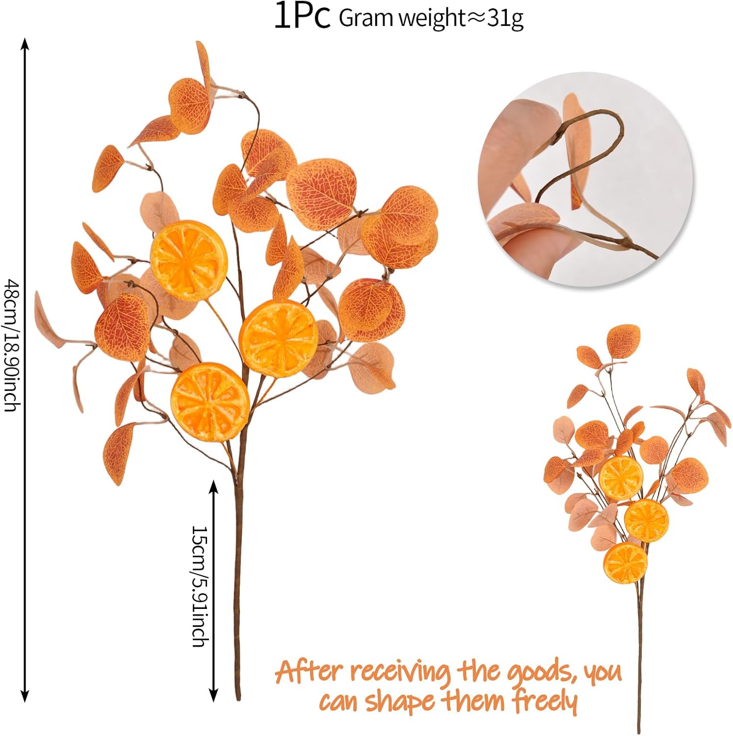 - Durable Plastic: Our orange eucalyptus stems (faux) with realistic orange leaves are made of premium fade-resistant plastic—waterproof and easy to clean! Just wipe with a damp cloth