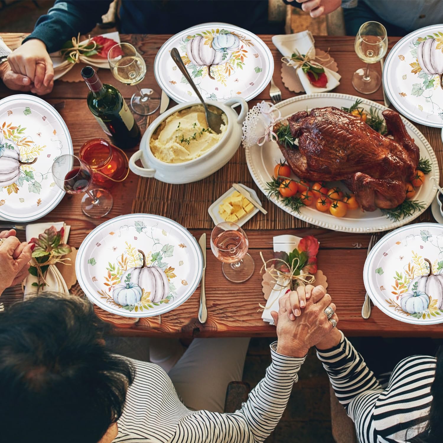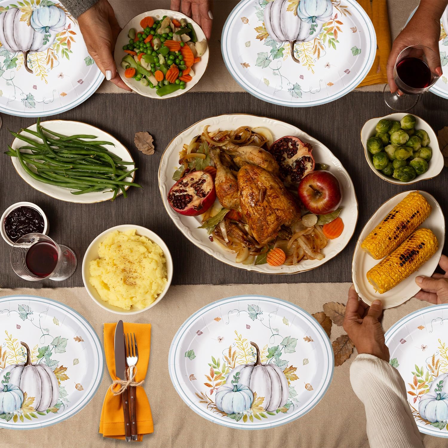 - Autumn Pumpkin Design: These Thanksgiving disposable plates feature a soft and elegant fall design with a white and light blue pumpkin centerpiece, surrounded by watercolor foliage, wheat stalks, and delicate autumn leaves. Perfect for Thanksgiving dinners, fall weddings, baby showers, or any seasonal gathering, these plates bring a fresh and graceful vibe to your festive table setting