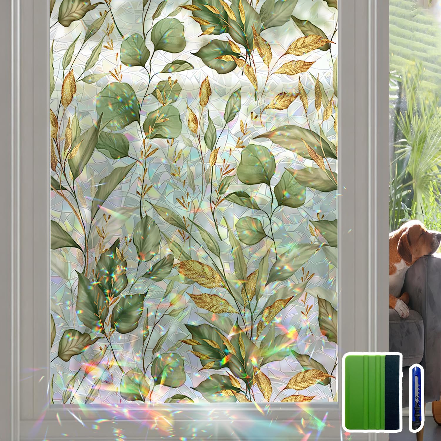 Rainbow Window Privacy Film with Tools, 3D Stained Glass Window Film, Spring & Autumn Leaves, 16.93" x 118.11"(43X300CM)