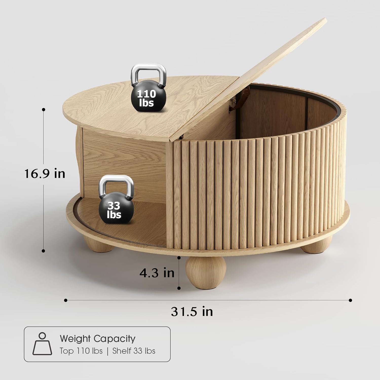 Round Coffee Table with Storage,Fluted Lift Up Coffee Table with Sliding Door,31.5" Drum Center Table with Bun Feet for Living Room,Home Small Space,Oak