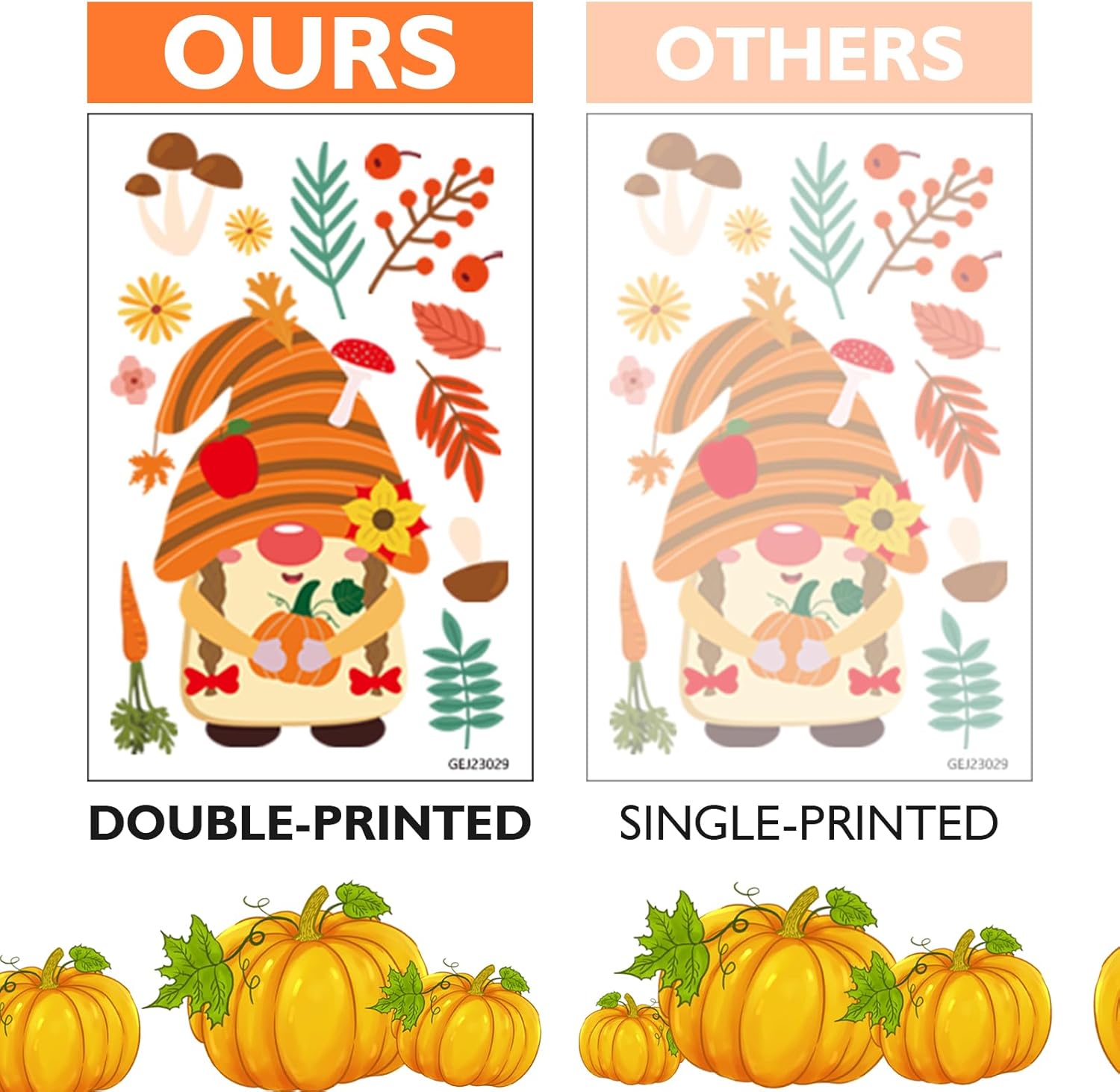 - VALUE PACKAGE: 9 sheets colorful Fall Window Clings set includes a variety of autumn(thanksgiving)-themed designs such as Gnome,pumpkins,maple leaves,nuts,Enough to meet your diverse needs.Fall harvest window decals,It makes people truly feel the joy of autumn harvest.