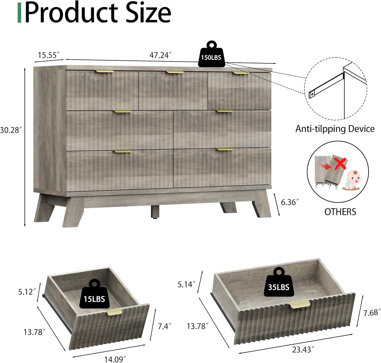- ăSolid Material & Study ConstructionăThe dressers & chests of drawers are constructed from optimal MDF, P2 engineered wood and coated metal handle which not only has exquisite texture, but also ensure long-term use and scratch resistant. Each drawer holds up to 35 lbs or 15 lbs and the thickened tabletop can support up to 150 lbs. For easy cleaning, just wipe with damp cloth and get it air-dried