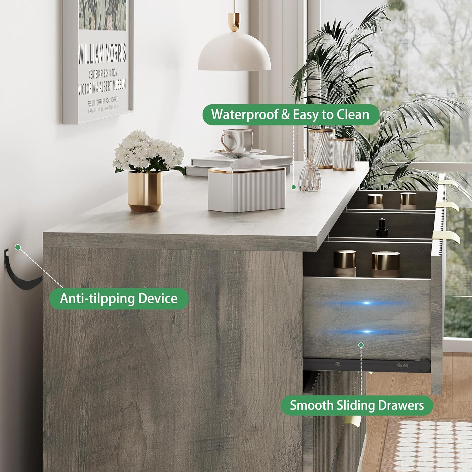 - ăStability & SafetyăThe white/black/natural oak dresser is equipped with an anti-tipping device, which can be fixed on the wall to prevent accidents. Each drawer contains a wide metal handle and built-in slide rail, easy to push and pull. Besides, the sturdy base provides this dresser with drawers a strong support and the middle feet can be adjustable to keep balance on uneven floors