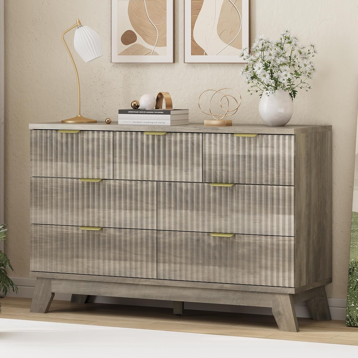Fluted Dresser for Bedroom with 7 Drawers, 48" Wide Modern Chest of Drawers with Metal Handle, Wood Dresser TV Stand, Wooden Closet Clothes Storage Organizer for Living Room, Hallway, Grey