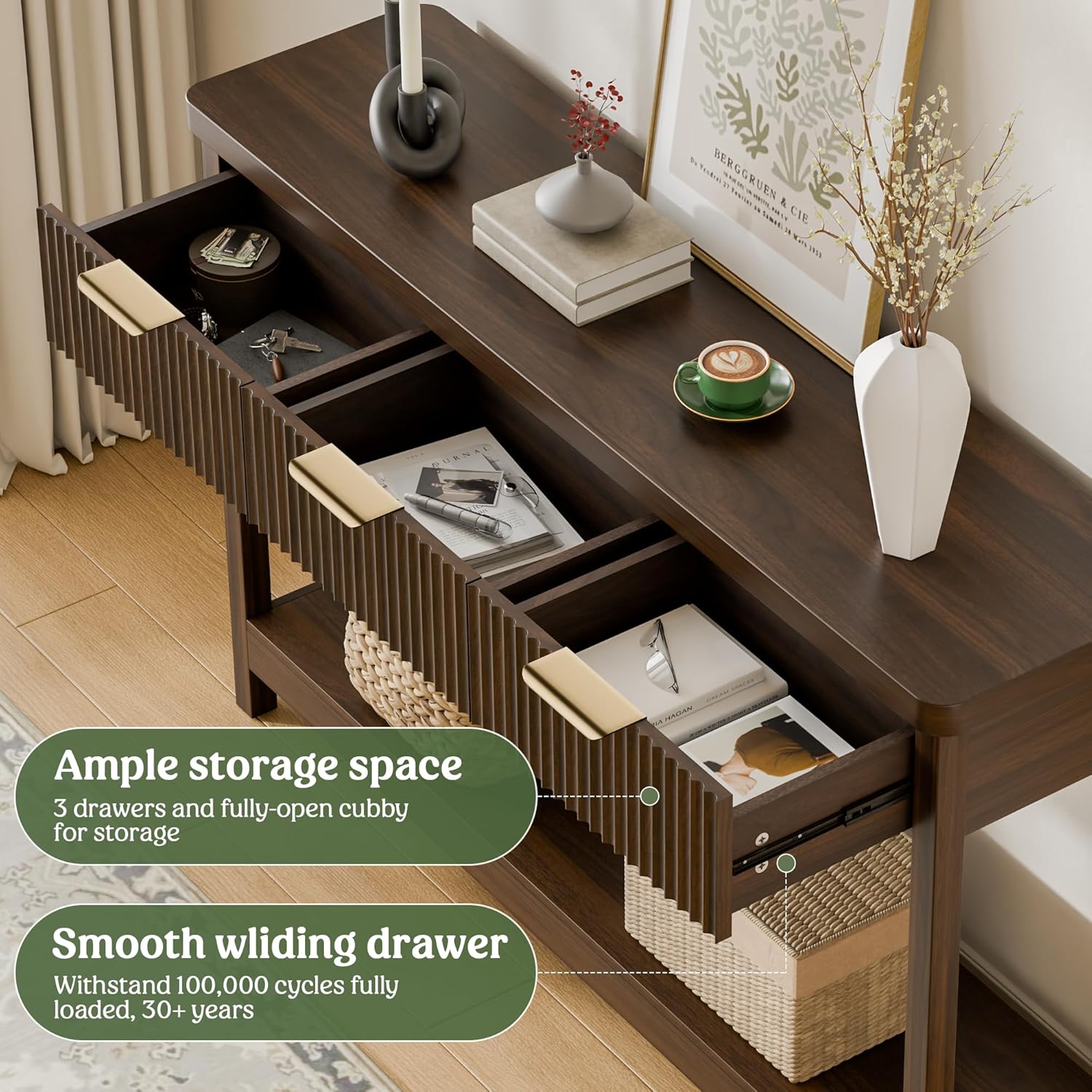 - Smart 3-Drawer Storage: The 3 smooth-gliding drawers with ultra-minimal hardware provide much-needed additional storage for keys, mail, and small essentials while maintaining a clutter-free look