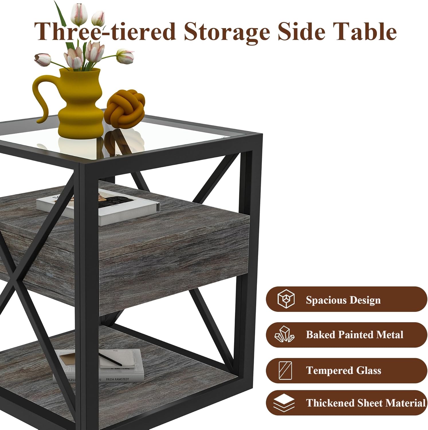 Farmhouse End Table, Modern Side Table with Drawer&3-Tier Storage Shelf, Square Rustic Nightstand, Accent Tea Table, for Bedroom Office Living Room, Grey, Natural Wood, Glass, Metal