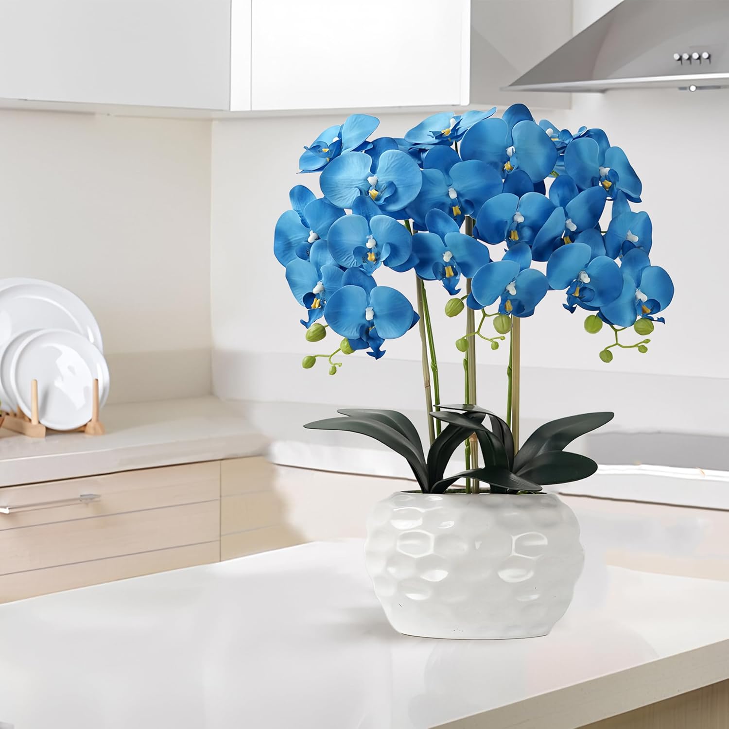 Orchid Artificial Flowers with White Vase Large Silk Faux Phalaenopsis Flowers for Dining Room Table Floral Centerpieces Indoor Decoration,Blue
