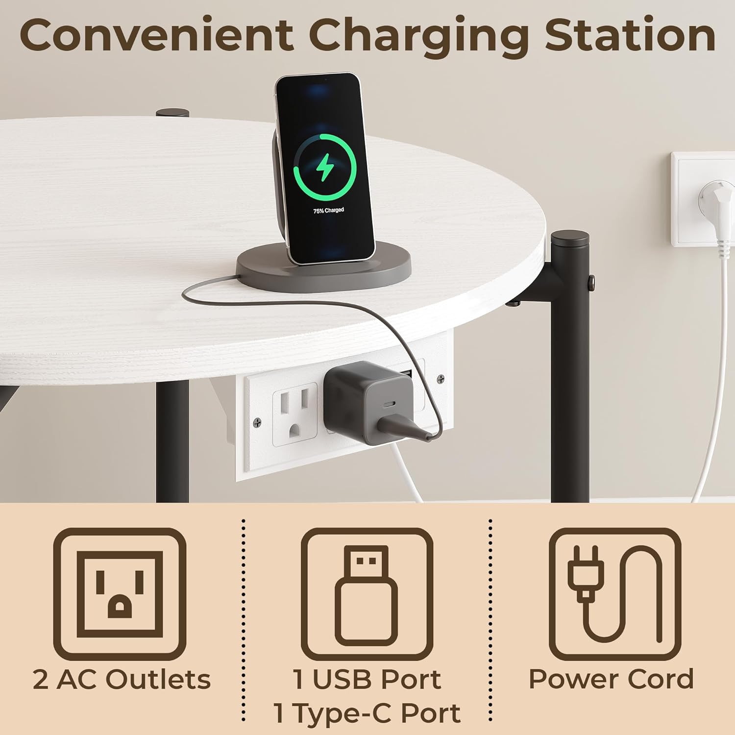 - 【Round Table with Charging Station】These round side table set of 2 features 2 AC outlets, 1 USB port, and 1 Type-C port on the sides, allowing you to charge your phone, tablet, desk lamp, and other electronic devices directly on the tabletop without worrying about spilling coffee