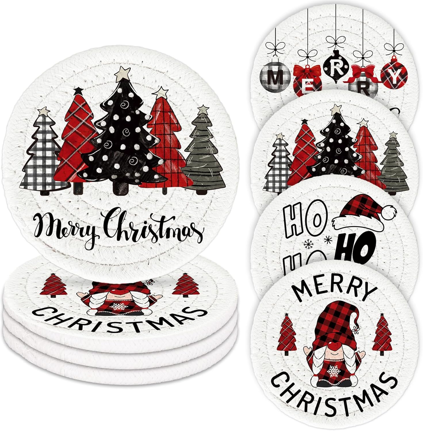 Whaline Merry Christmas Cotton Coasters Xmas Plaid Tree Gnome Handmade Braided Drink Coasters Absorbent Cup Mats for Christmas Holiday Party Home Table Decor, Set of 4