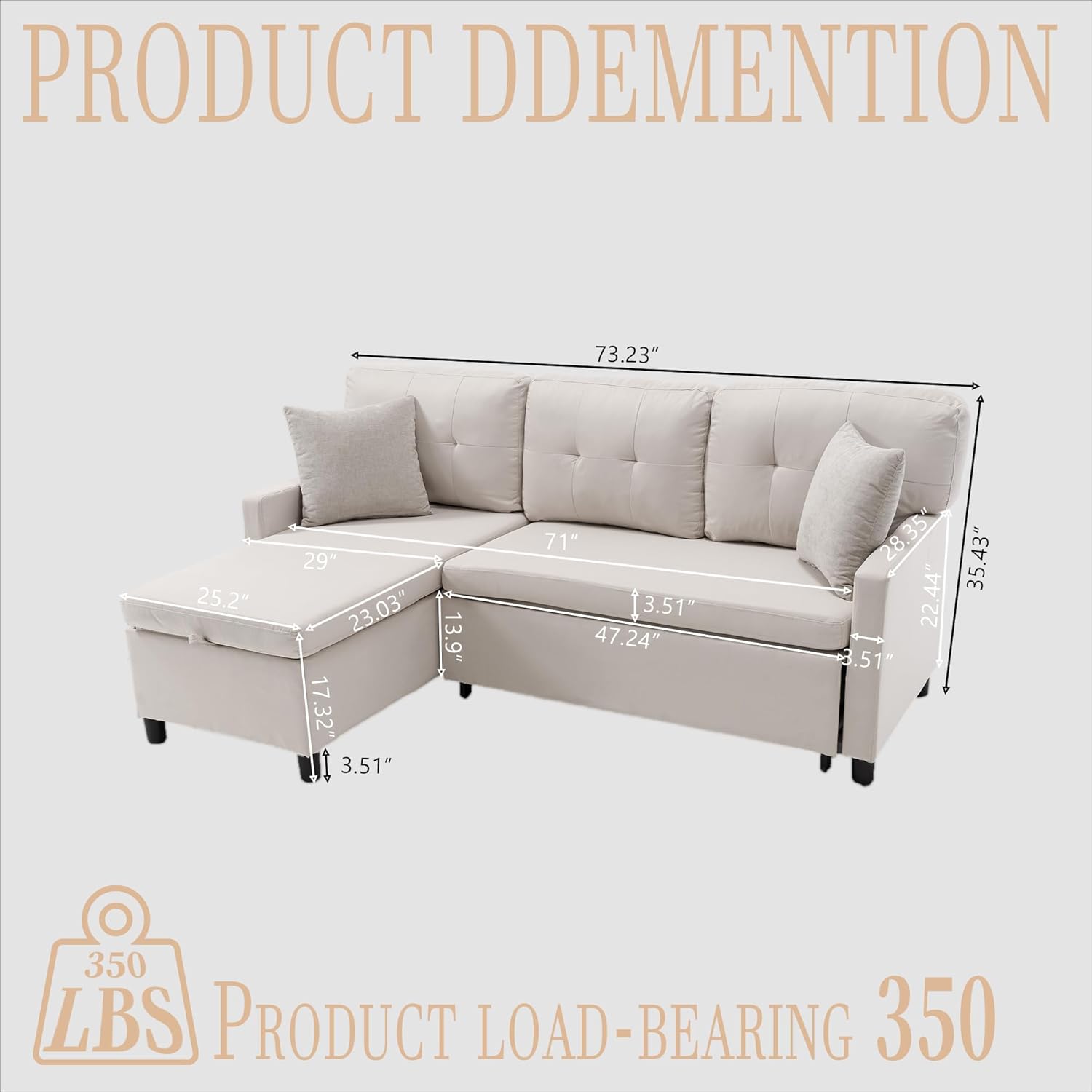 Pull Out Couch, Oversized Sleeper Sofa Couch, Sectional Sleeper Sofa Bed for Living Room Bedroom Lounge (Beige, 73 Inch)