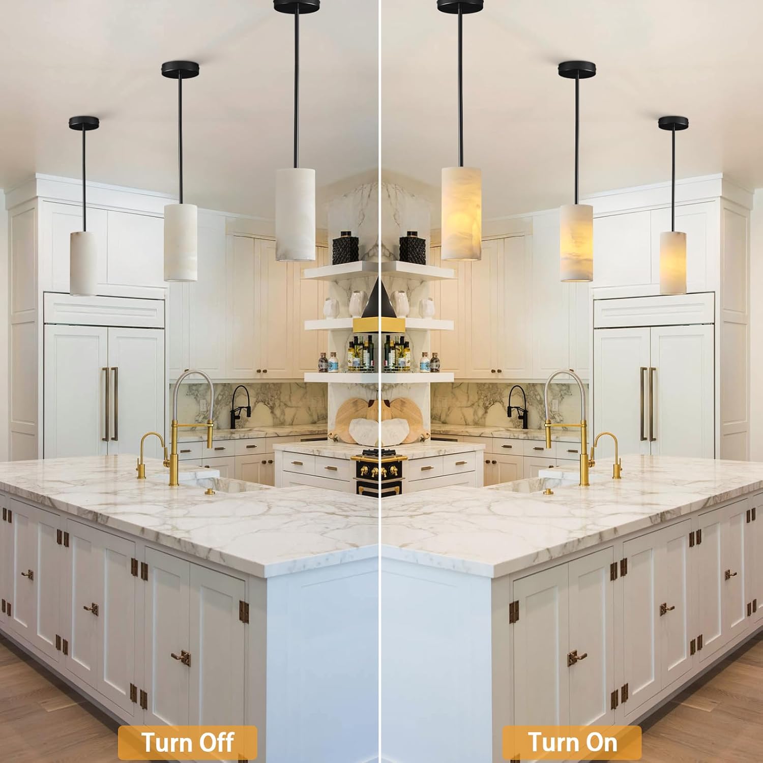 - 【Natural Spanish Alabaster】Alabaster pendant lights kitchen island is made of alabaster imported from Spain, a natural stone solidified by volcanic lava for millions of years. It is strong and durable, and the lighting effect is bright and non-glare. Each piece of alabaster is carefully selected and hand-polished, presenting a delicate and charming appearance, enhancing the natural beauty of the stone.