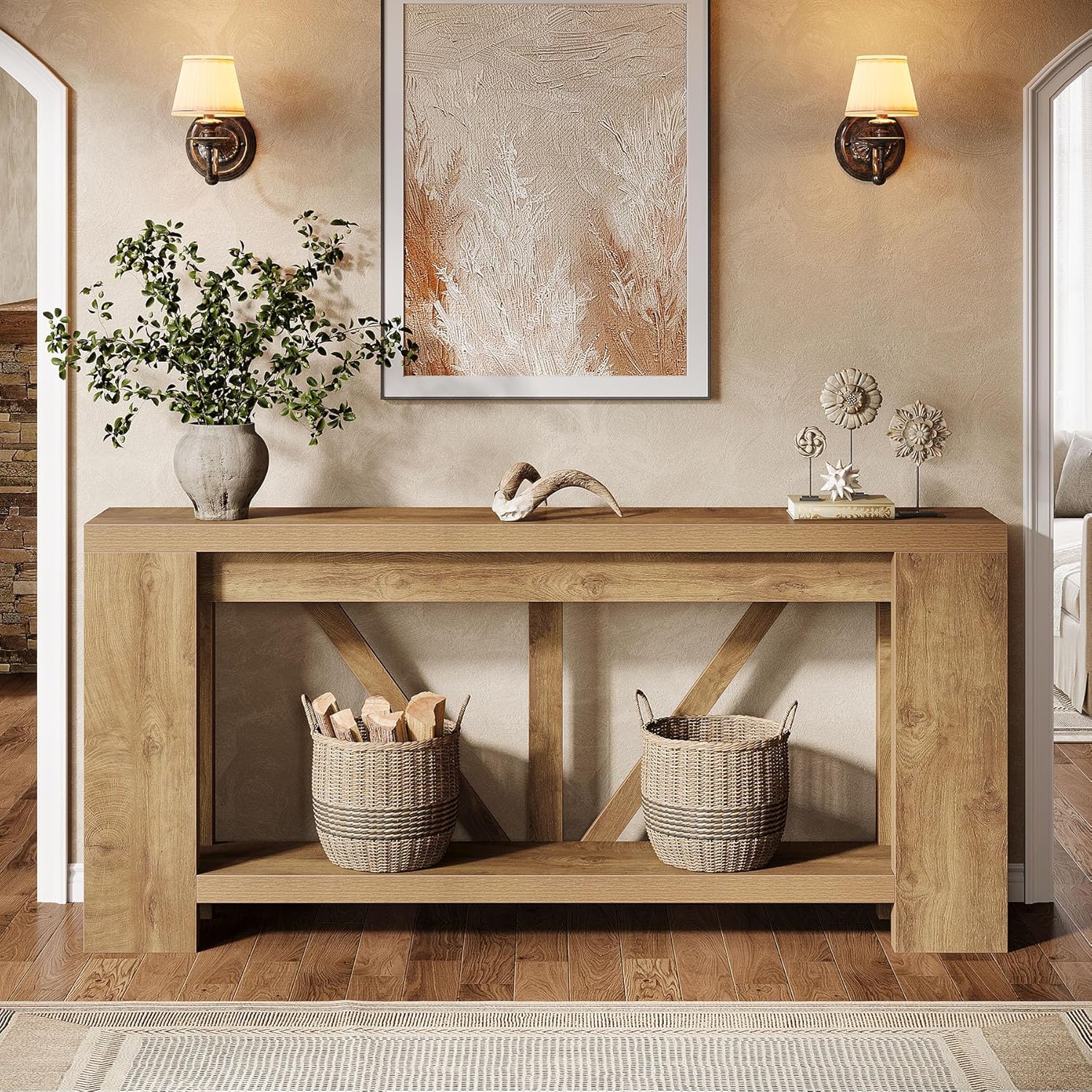 - Farmhouse Aesthetic: Featuring wood-grain veneer and bold geometric lines, this sofa console blends farmhouse warmth with modern flair, creating a cozy, welcoming vibe. Its timeless look pairs effortlessly with contemporary, rustic, or minimalist home décor styles