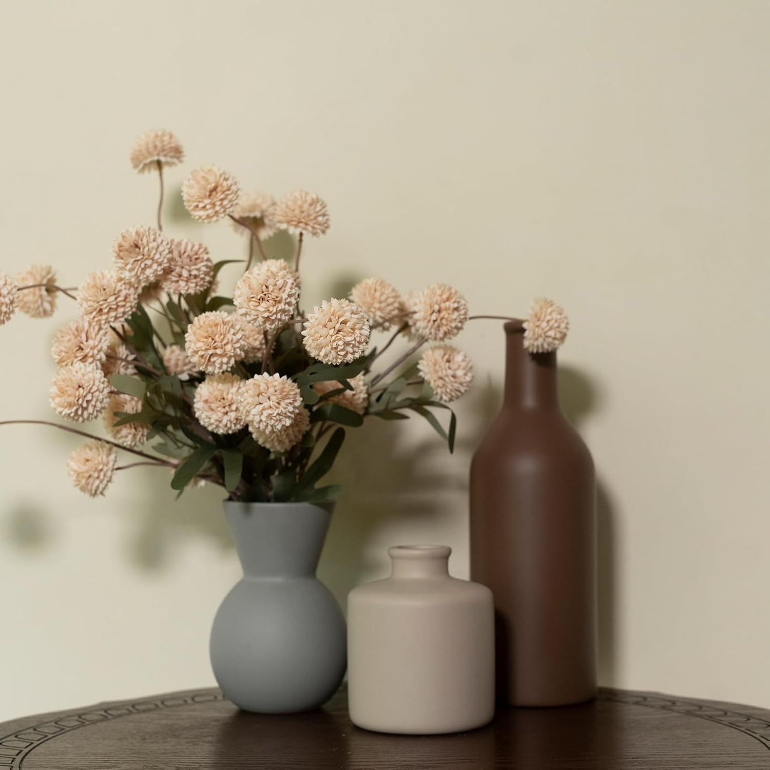 - Vase with Dried Bouquet - Contains 8 mini ball chrysanthemums, with 5 small flower heads on each stem, for a total of 40 flower heads. The fake flower balls are made of high-quality artificial silk, and the stems are made of iron wire and wrapped in flower bags, which is easy to cut and very flexible.